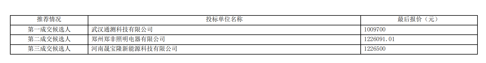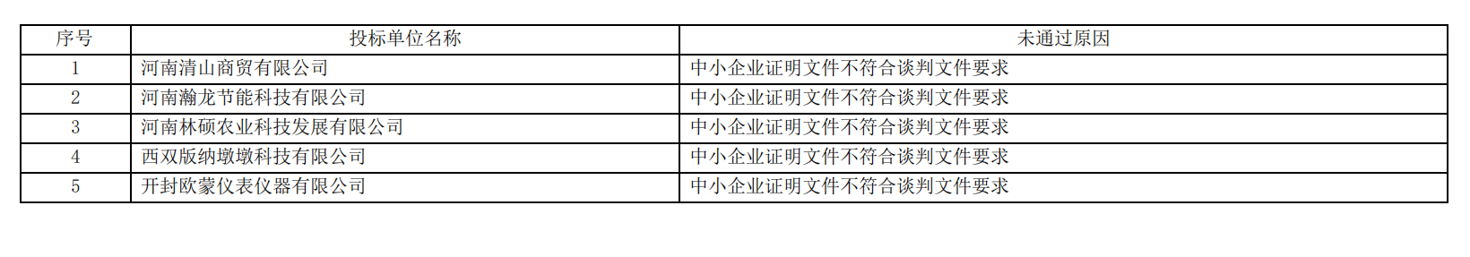 | (*)本项目河南清山商贸有限公司、河南瀚龙节能科技有限公司、河南林硕农业科技发展有限公司、西双版纳墩墩科技有限公司、开封欧蒙仪表仪器有限公司因中小企业证明文件不符合谈判文件要求未通过资格审查。(*)未成交供应商排序:第*名:郑州郑非照明电器有限公司,第*名:河南晟宝隆新能源科技有限公司,第*名:南阳昂科建筑劳务分包有限公司,第*名:南阳昂科建筑劳务分包有限公司。(*)各有关当事人对中标结果有异议的,可以在评标结果公告发布之日起七个工作日内,以书面形式同时向采购人和采购代理机构提出质疑(法人签字盖章并加盖单位公章),由法定代表人或其授权代表携带本人身份证件(原件)一并提交(邮寄、传真件不予受理)。逾期未提交或未按照要求提交的质疑函将不予受理。 | |||||||||||||||||||||||||||||||