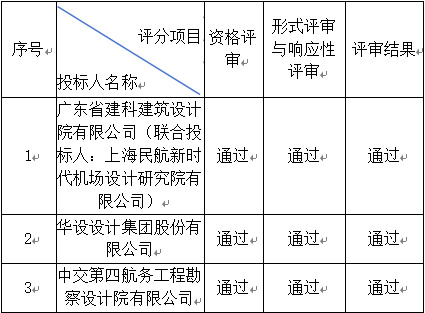 评标情况 | 截止至****年*月*日**时**分,*家投标单位(广东省建科建筑设计院有限公司(联合投标人:上海民航新时代机场设计研究院有限公司)、华设设计集团股份有限公司、中交第四航务工程勘察设计院有限公司)按规定递交了投标文件。 评标委员会共*名专家,*名专家均依法从广东省综合评标专家库中随机抽取。 *.资格审查和形式评审与响应性评审情况如下: