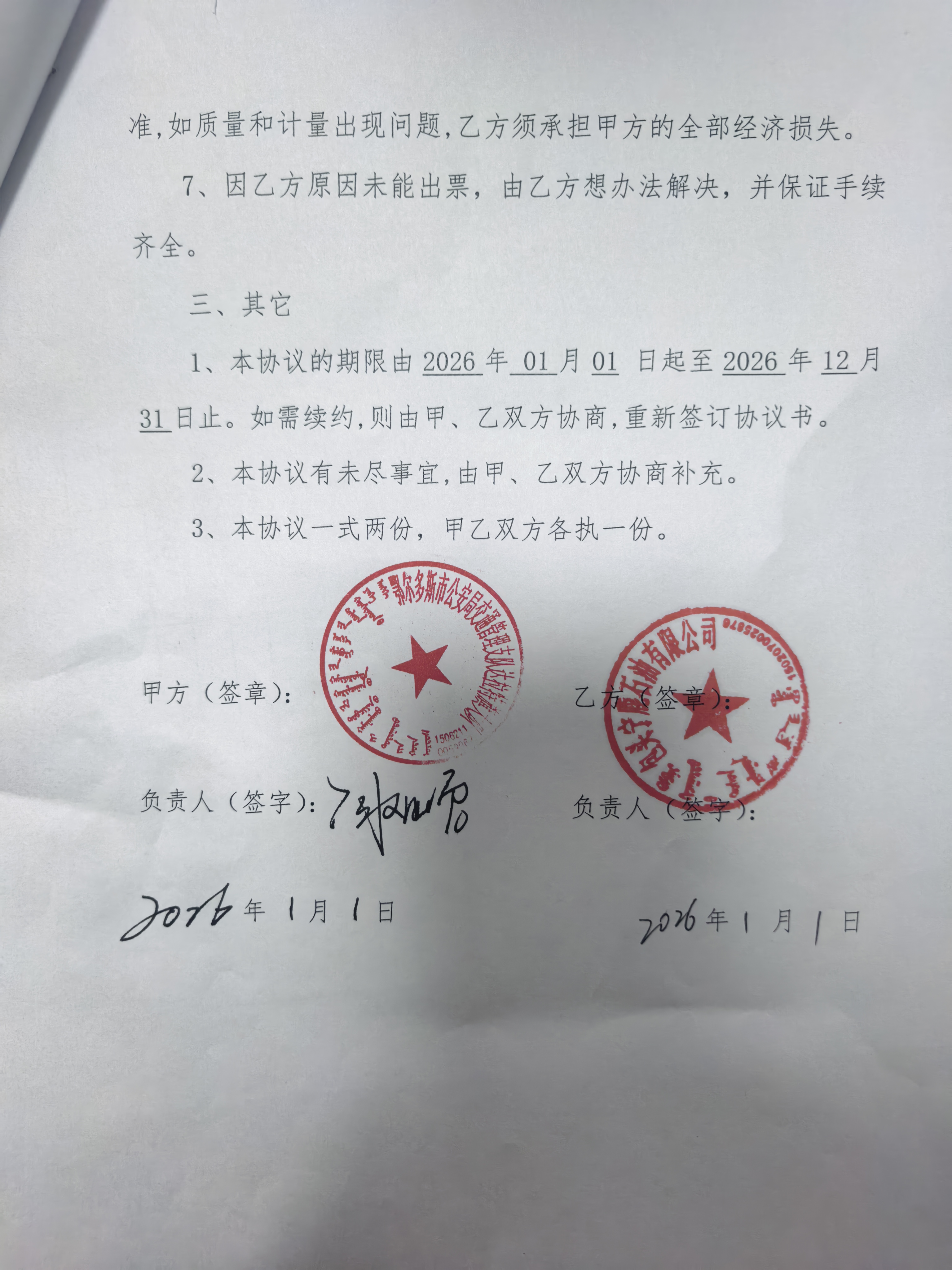 合同金额: *,***.**元,大写(人民币):伍仟贰佰元整 履约期限:****年**月**日至****年**月**日 履约地点:达拉特旗 采购方式: 七、合同签订日期****年**月**日 八、合同公告日期****年**月**日 九、其他补充事宜