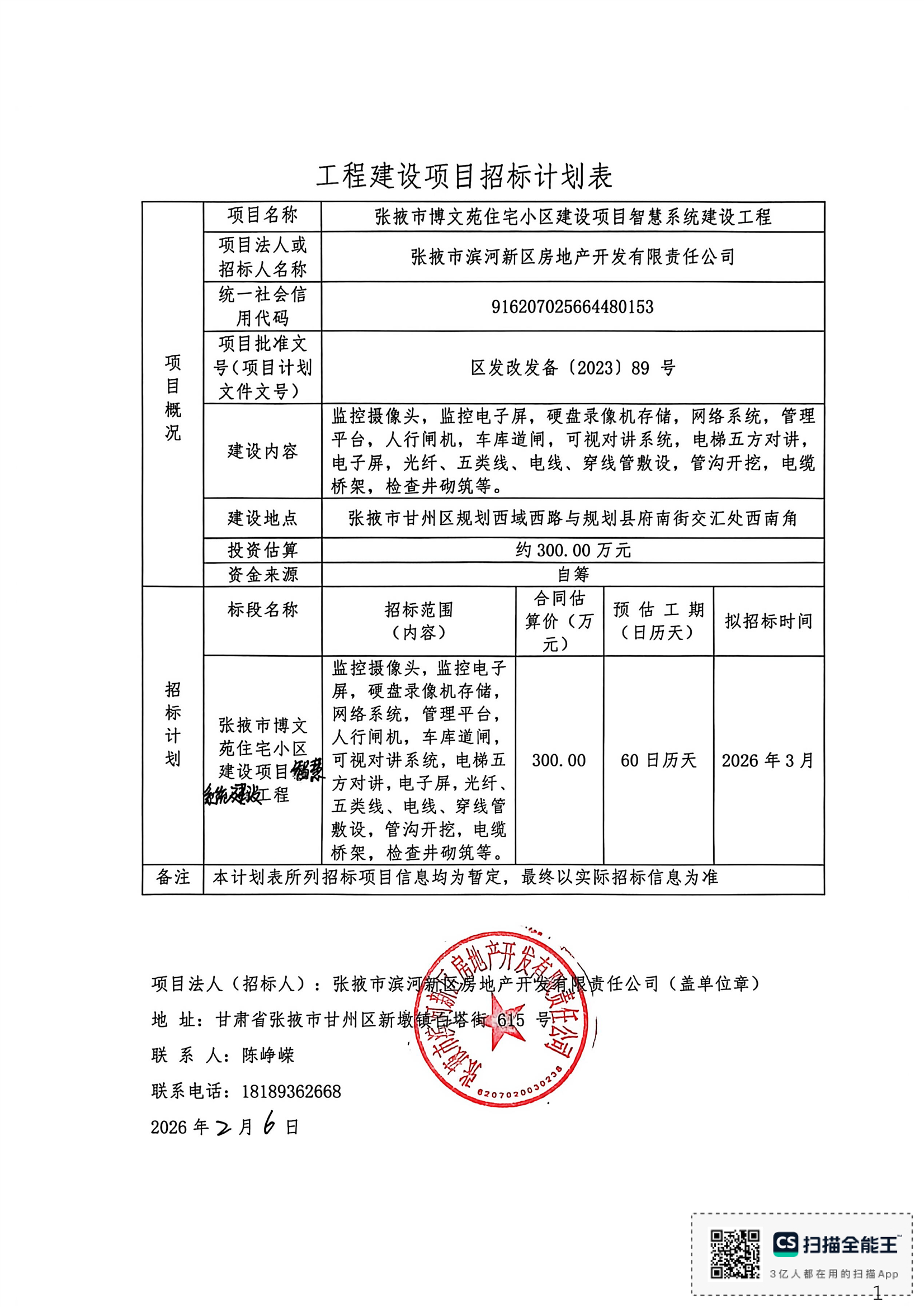 张掖市博文苑住宅小区建设项目智慧系统建设工程招标计划