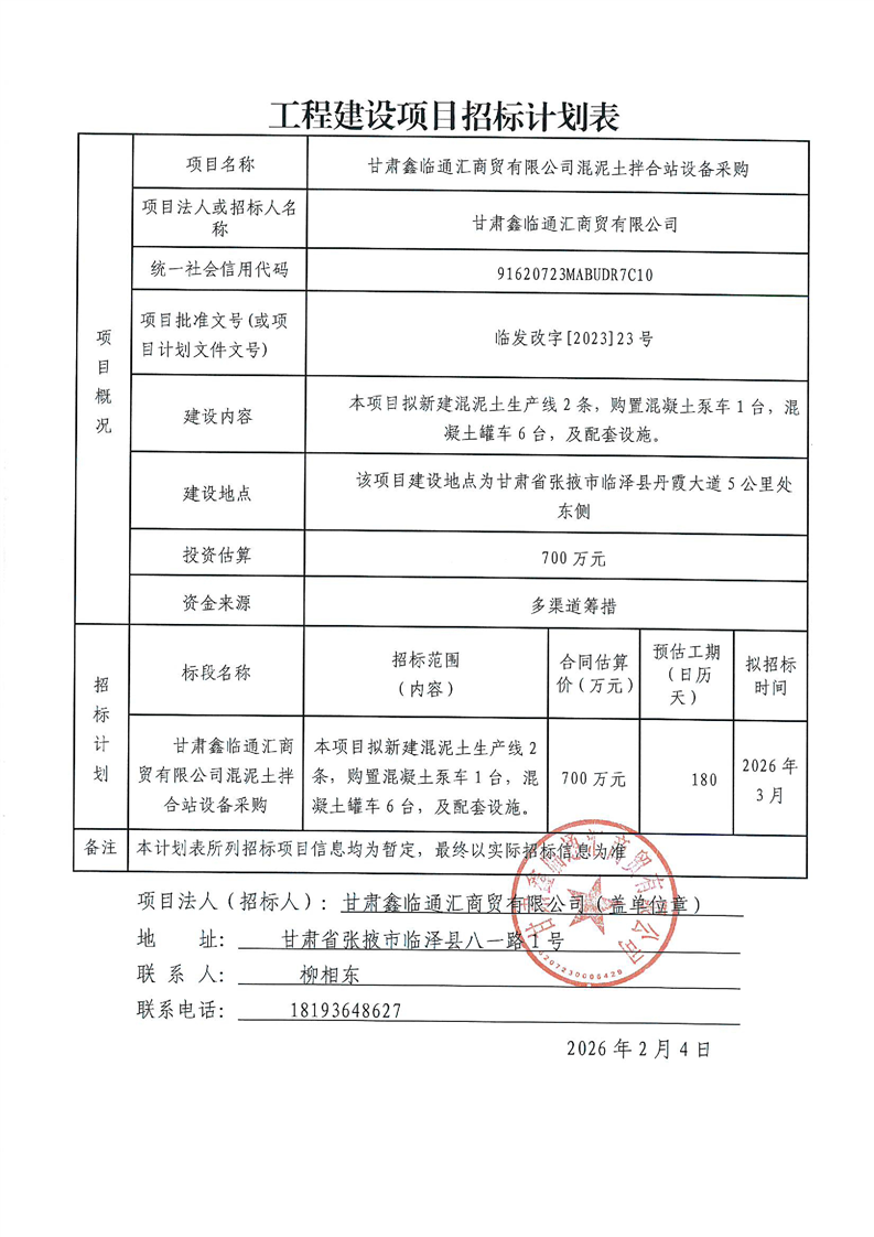 甘肃鑫临通汇商贸有限公司混泥土拌合站设备采购招标计划