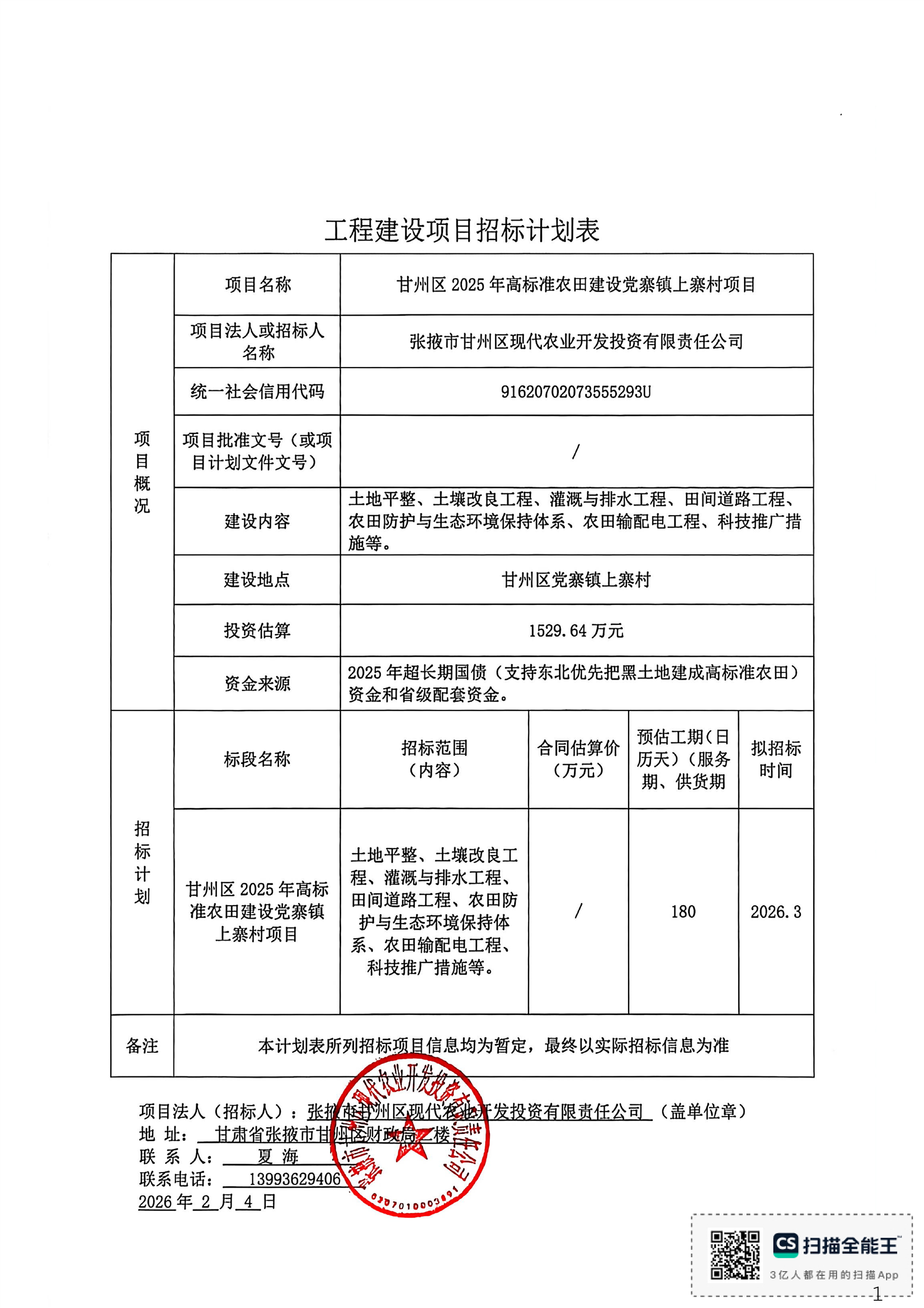 甘州区2025年高标准农田建设党寨镇上寨村项目招标计划