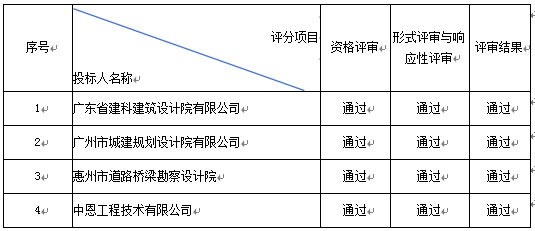 评标情况 | 截止至****年**月**日**时**分,以下*家投标单位按规定递交了投标文件。 广东省建科建筑设计院有限公司、广州市城建规划设计院有限公司、惠州市道路桥梁勘察设计院、中恩工程技术有限公司。 评标委员会共*名专家,*名专家均依法从广东省综合评标专家库中随机抽取。 *.资格审查和形式评审与响应性评审情况如下: ![]() *.定标候选人名称: ![]() | ||