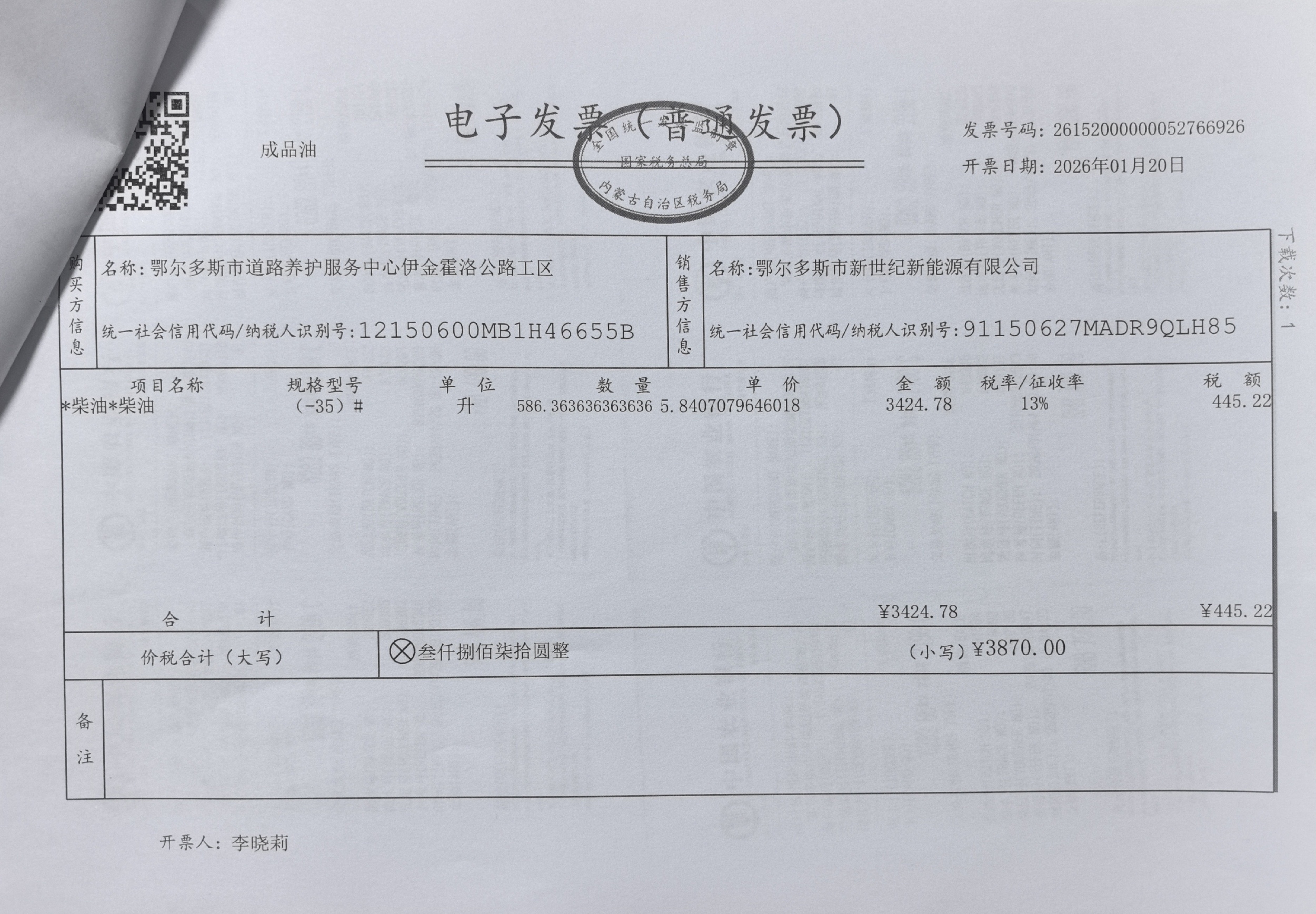 鄂尔多斯市道路养护服务中心伊金霍洛公路工区车辆加油服务(台格庙养护站)政府采购合同公告