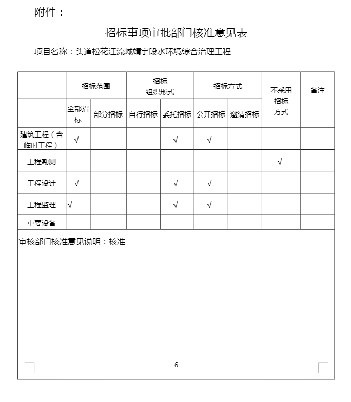 (四)该项目招标范围、组织形式、招标方式详见附件《招标事项审批部门核准意见表》,靖靖宇县宏泽建设投资发展有限公司要严格按照《中华人民共和国招标投标法》等法律法规规定,规范开展招投标工作。(五)本批复文件自印发之日起,《靖宇县发展和改革局关于头道松花江流域靖宇段水环境综合 治理工程可行性研究报告(代项目建议书)(修改版)的批复》(靖发改审批字〔****〕***号)的批复予以废止。