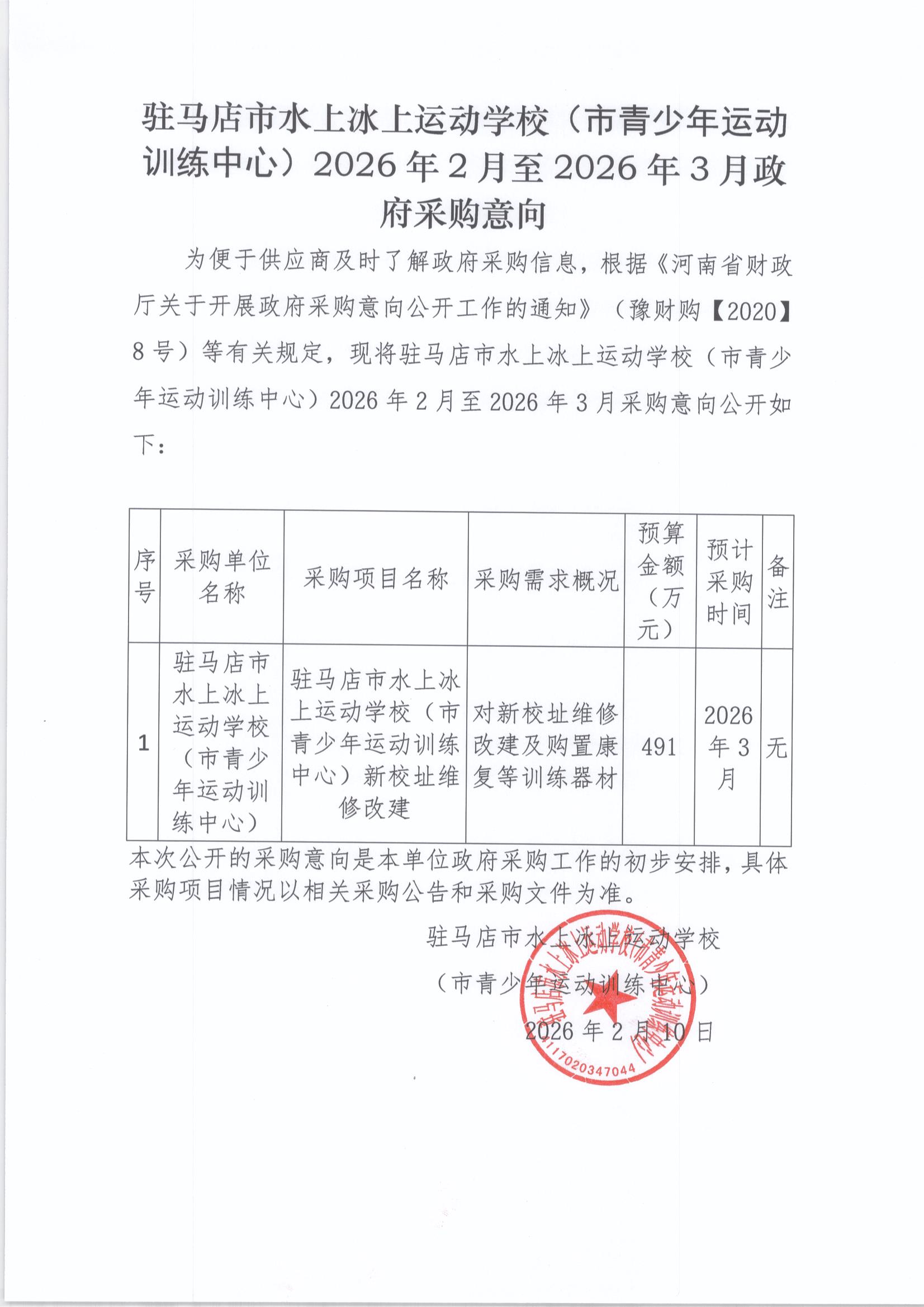 驻马店市水上冰上运动学校(市青少年运动训练中心)2026年2至3月政府采购意向