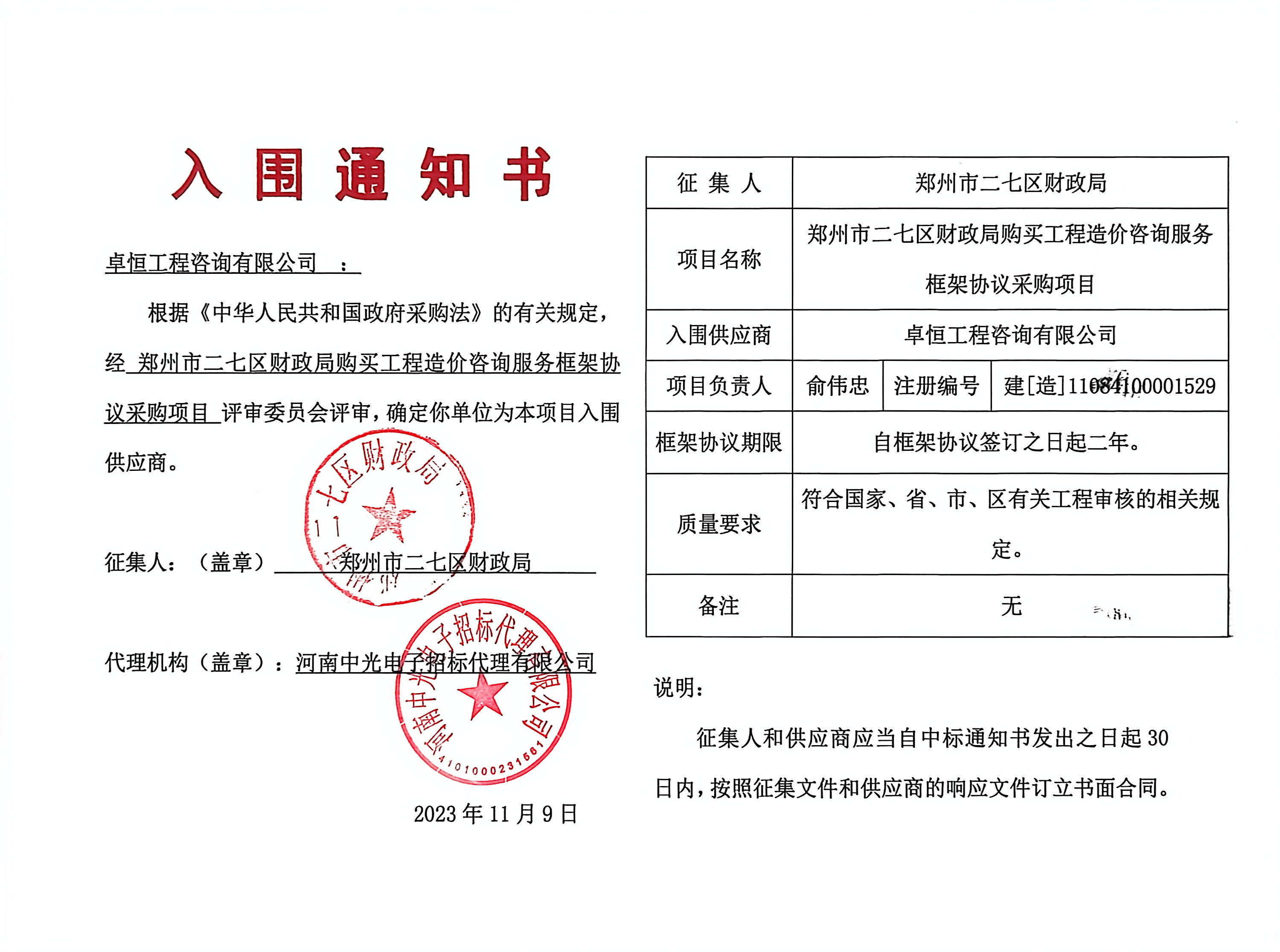 郑州市二七区财政局购买工程造价咨询服务框架协议采购项目
