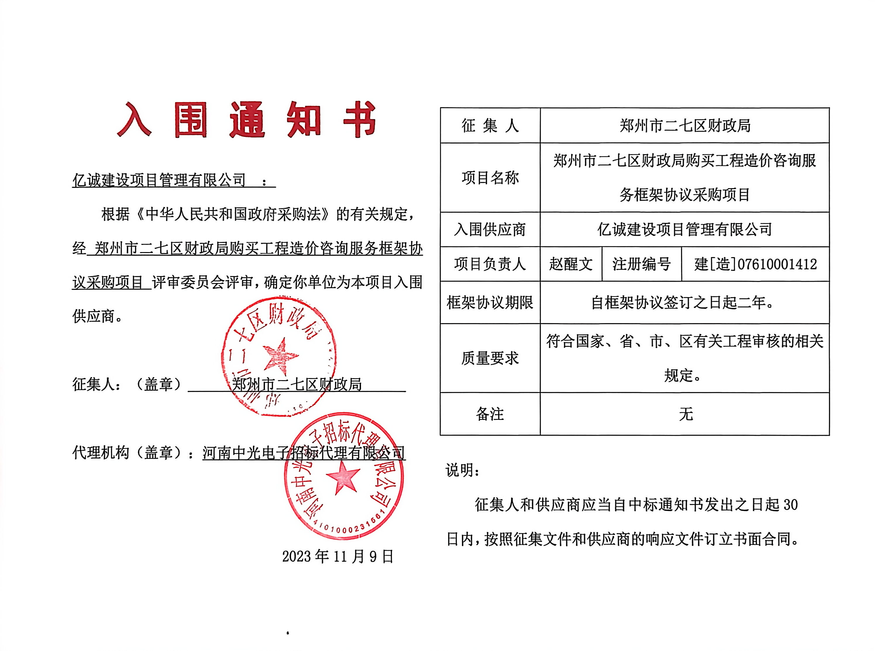 郑州市二七区财政局购买工程造价咨询服务框架协议采购项目