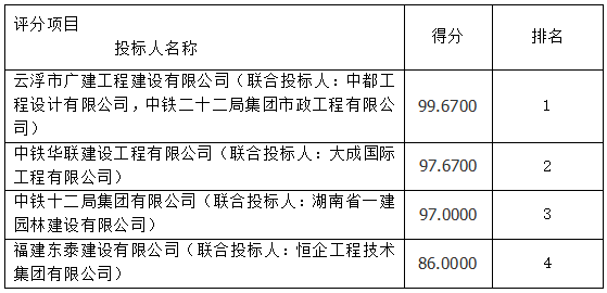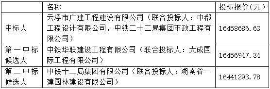 中标人 | 云浮市广建工程建设有限公司(联合投标人:中都工程设计有限公司,中铁二十二局集团市政工程有限公司) | ||