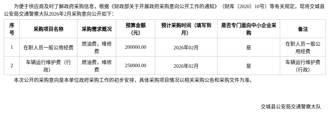 交城县公安局交通警察大队2026年2月政府采购意向