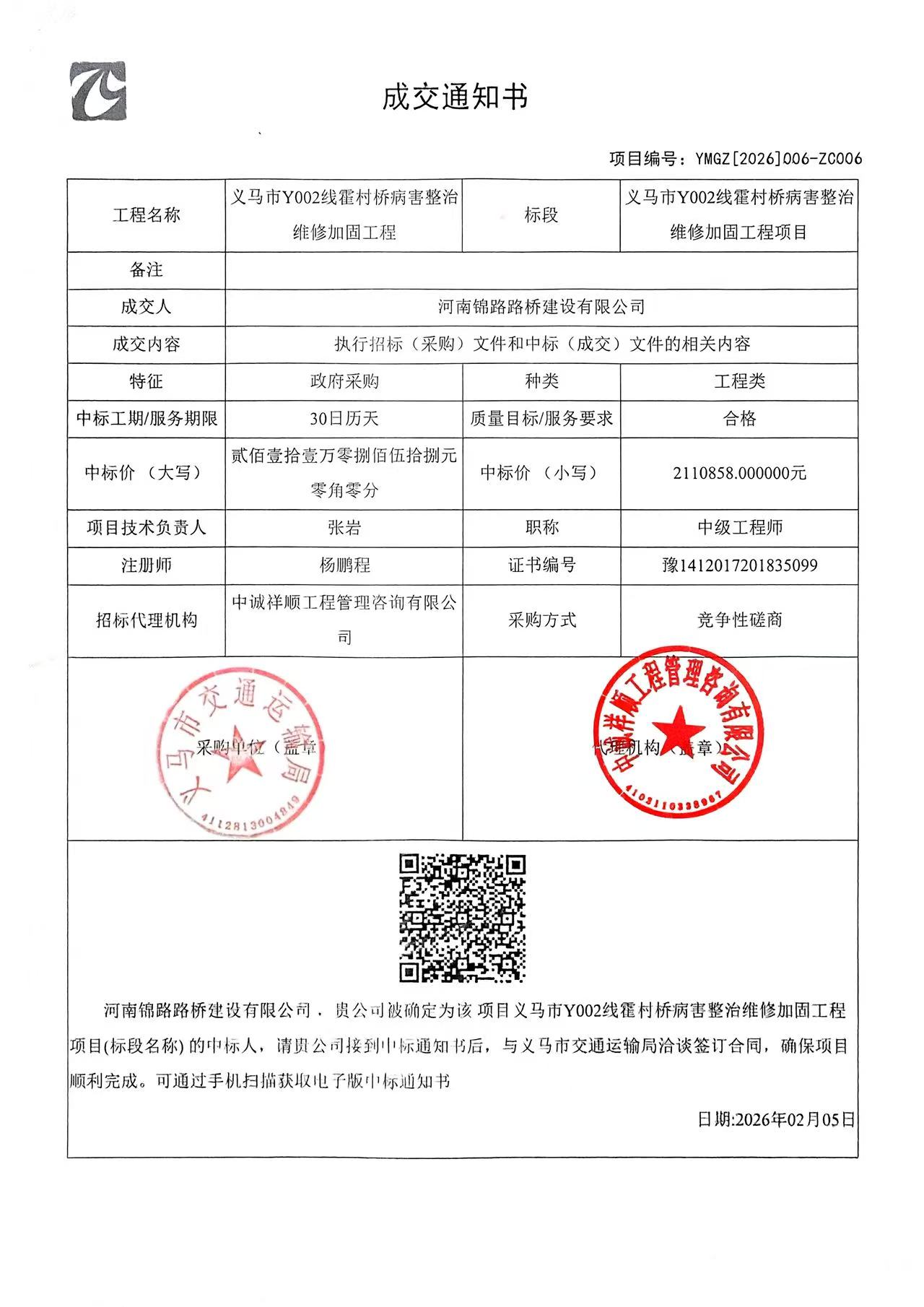 | 工程概况:本项目位于义马市,内容为霍村桥桥面维修加固。 资金来源:财政资金,已落实 项目地点:义马市 计划工期:**日历天 质量要求:合格 合同履约期限:**日历天 | ||||||||||||