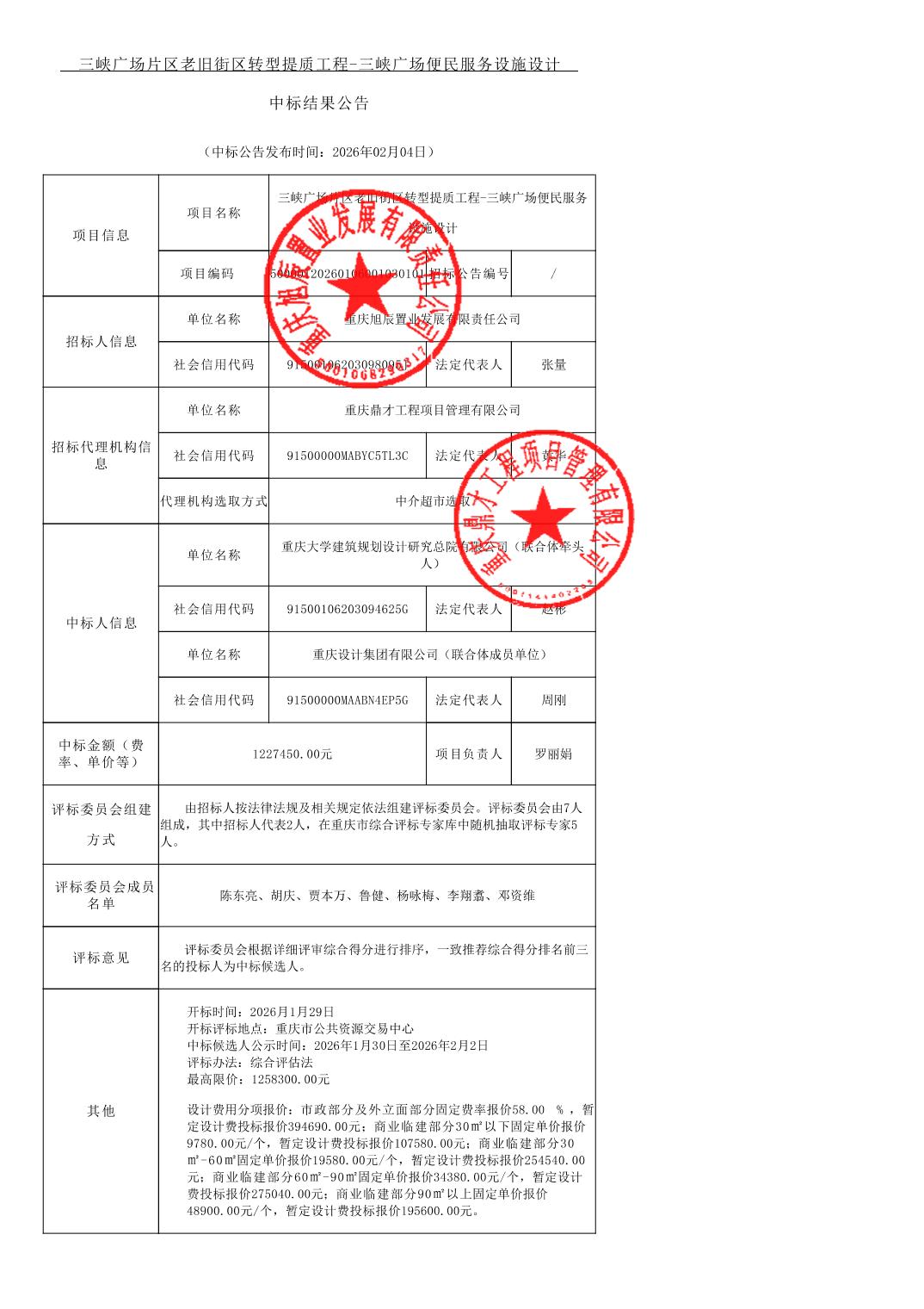 三峡广场片区老旧街区转型提质工程-三峡广场便民服务设施设计中标结果公告
