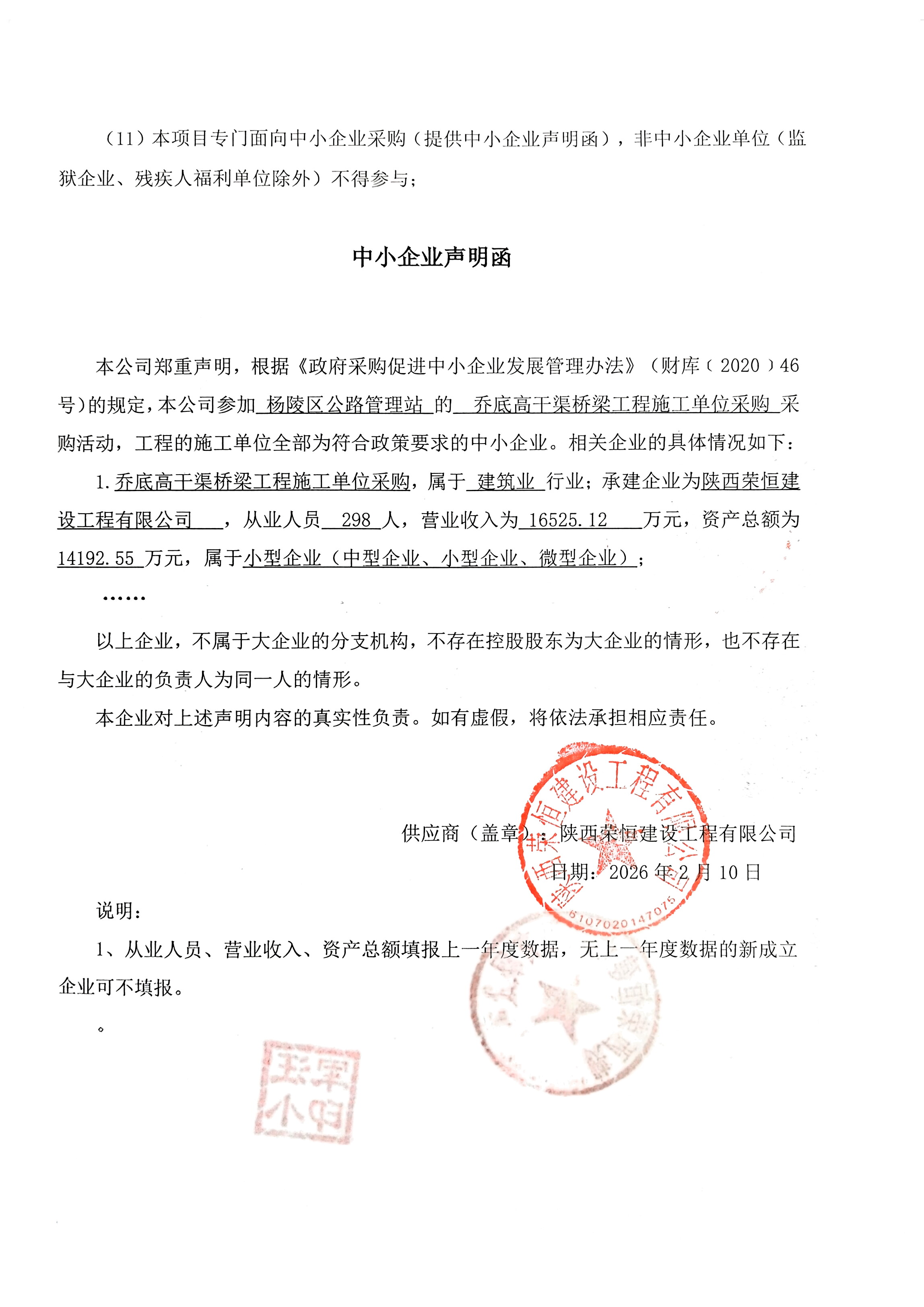 杨陵区公路管理站乔底高干渠桥梁工程施工单位采购中标(成交)结果公告