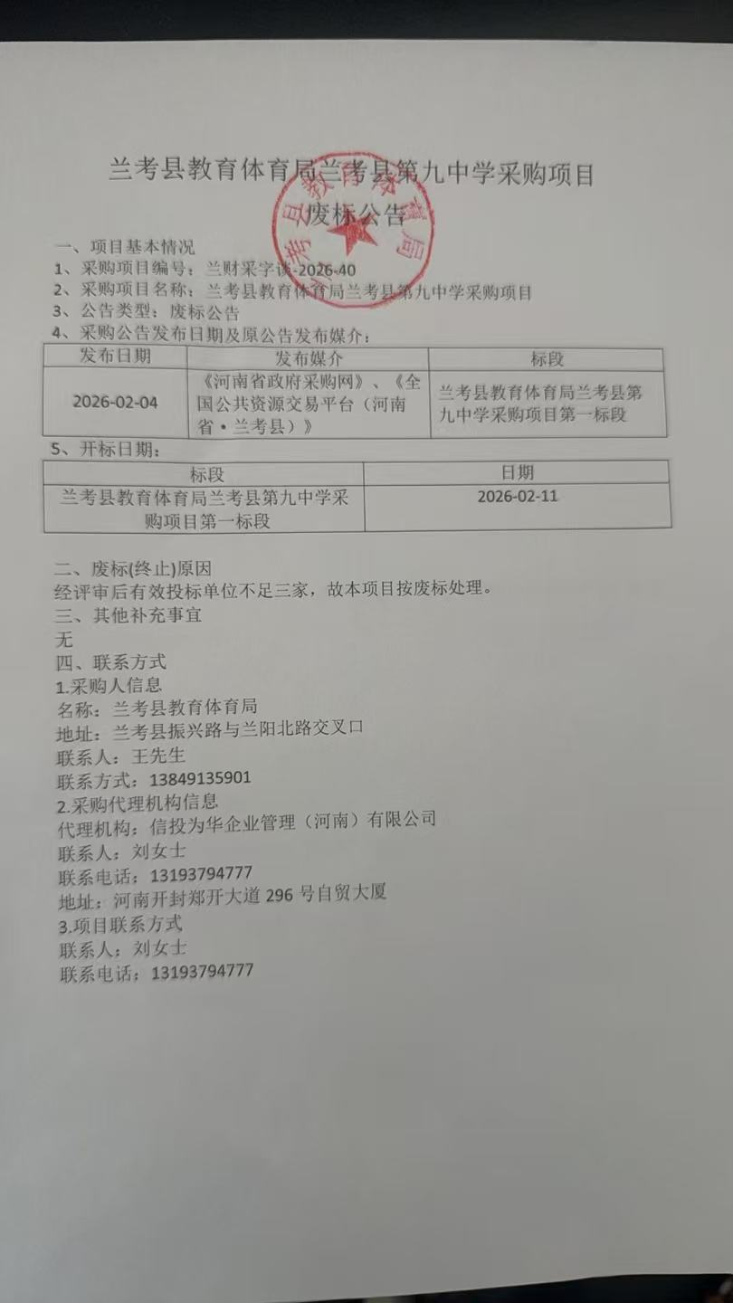 兰考县教育体育局兰考县第九中学采购项目-废标公告
