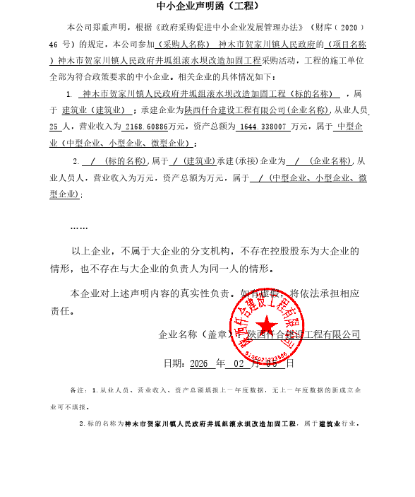 神木市贺家川镇人民政府井坬组滚水坝改造加固工程成交结果公告