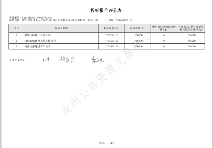 | *.开标记录表[详见附件*];*.初步评审表[详见附件*];*.谈判小组对所有响应人响应文件的最终报价排序[详见附件*];*.各谈判小组成员对所有响应人响应文件的分项评分明细[详见附件*];*.符合性审查汇总表[详见附件*];*.响应人的响应文件被否决原因[详见附件*];*.被推荐响应人名单及理由[详见附件*];*.根据评审结果、成交结果公告,按照国家有关规定,确定顺驰国际建工有限公司为成交人,其他响应人未成交。*.受理投诉监督管理部门:汝州市财政局 联系电话:************,************ 邮箱地址:********@***.*** 联系地址:汝州市望嵩中路***号 **. 响应人或其他利害关系人对本次公告如有异议,请按中华人民共和国财政部令第**号《政府采购质疑和投诉办法》的相关规定,在规定时间内,向采购人、采购代理机构、政府采购监督部门提出质疑、投诉等事宜。逾期未提交或未按照要求提交的质疑、投诉将不予受理。 | |||||||||||||||||||||||||||||||