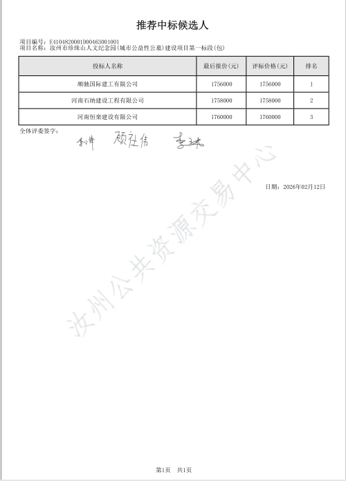 汝州市珍珠山人文纪念园(城市公益性公墓)建设项目成交公告