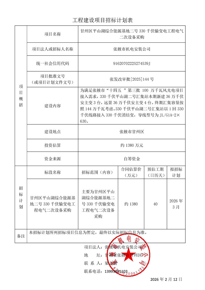 甘州区平山湖综合能源基地二号330千伏输变电工程电气二次设备采购招标计划