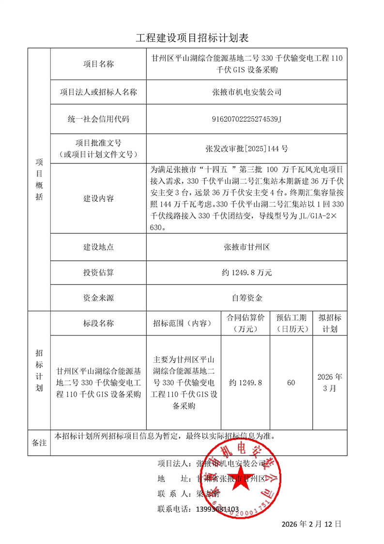 甘州区平山湖综合能源基地二号330千伏输变电工程110千伏GIS设备采购招标计划
