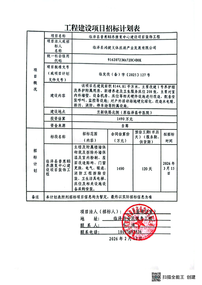 临泽县普惠颐养康复中心建设项目装饰工程招标计划