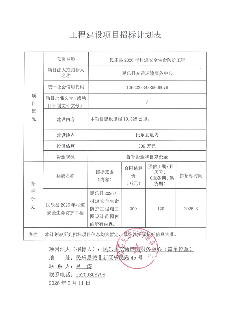 民乐县2026年村道安全生命防护工程招标计划