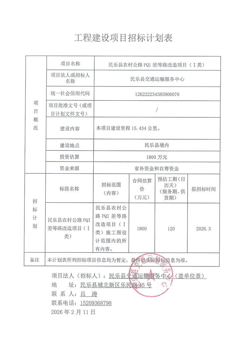 民乐县农村公路PQI差等路改造项目(Ⅰ类)招标计划