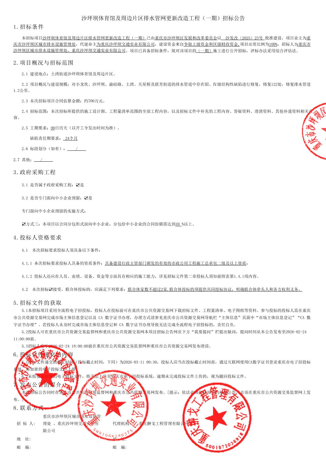 沙坪坝体育馆及周边片区排水管网更新改造工程(一期)招标公告