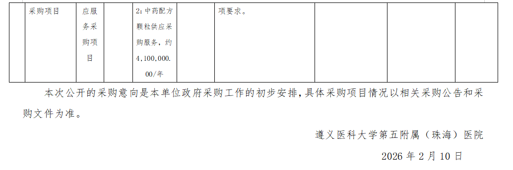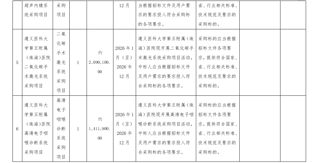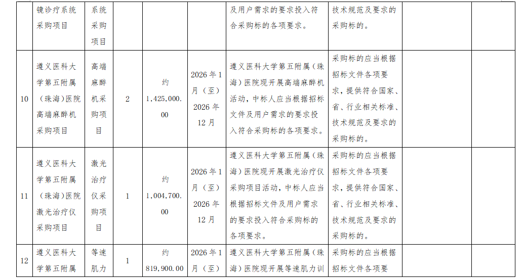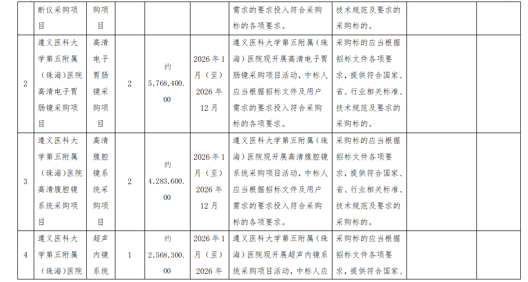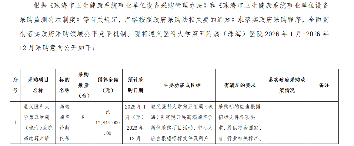 遵义医科大学第五附属(珠海)医院2026年1(至)12月医疗设备更新项目采购意向