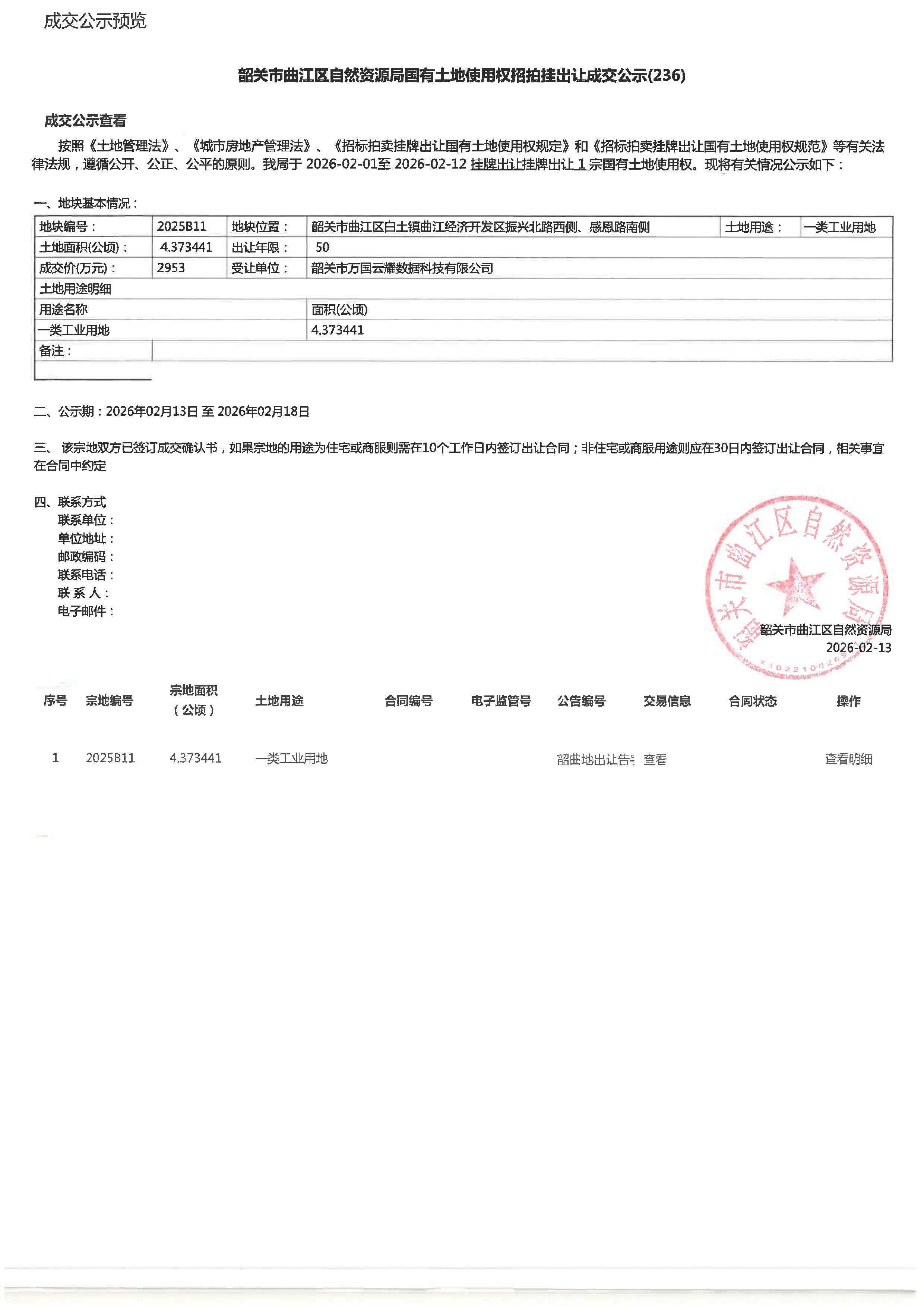 韶关市曲江区自然资源局国有土地使用权招拍挂出让成交公示(宗地编号:2025B11)[2026SG005]