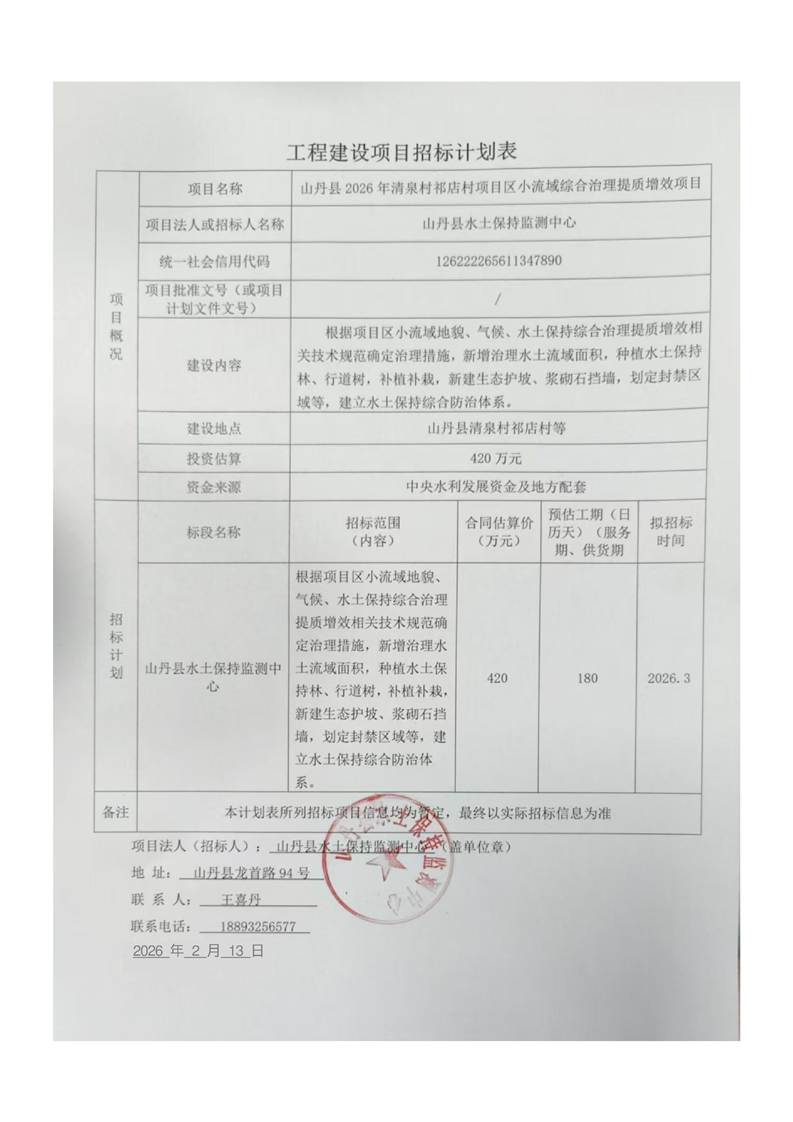 山丹县2026年清泉村祁店村项目区小流域综合治理提质增效项目招标计划