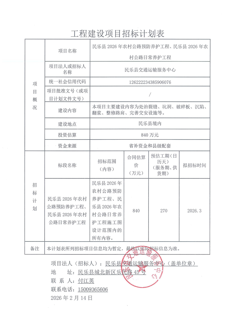 民乐县2026年农村公路预防养护工程、民乐县2026年农村公路日常养护工程招标计划