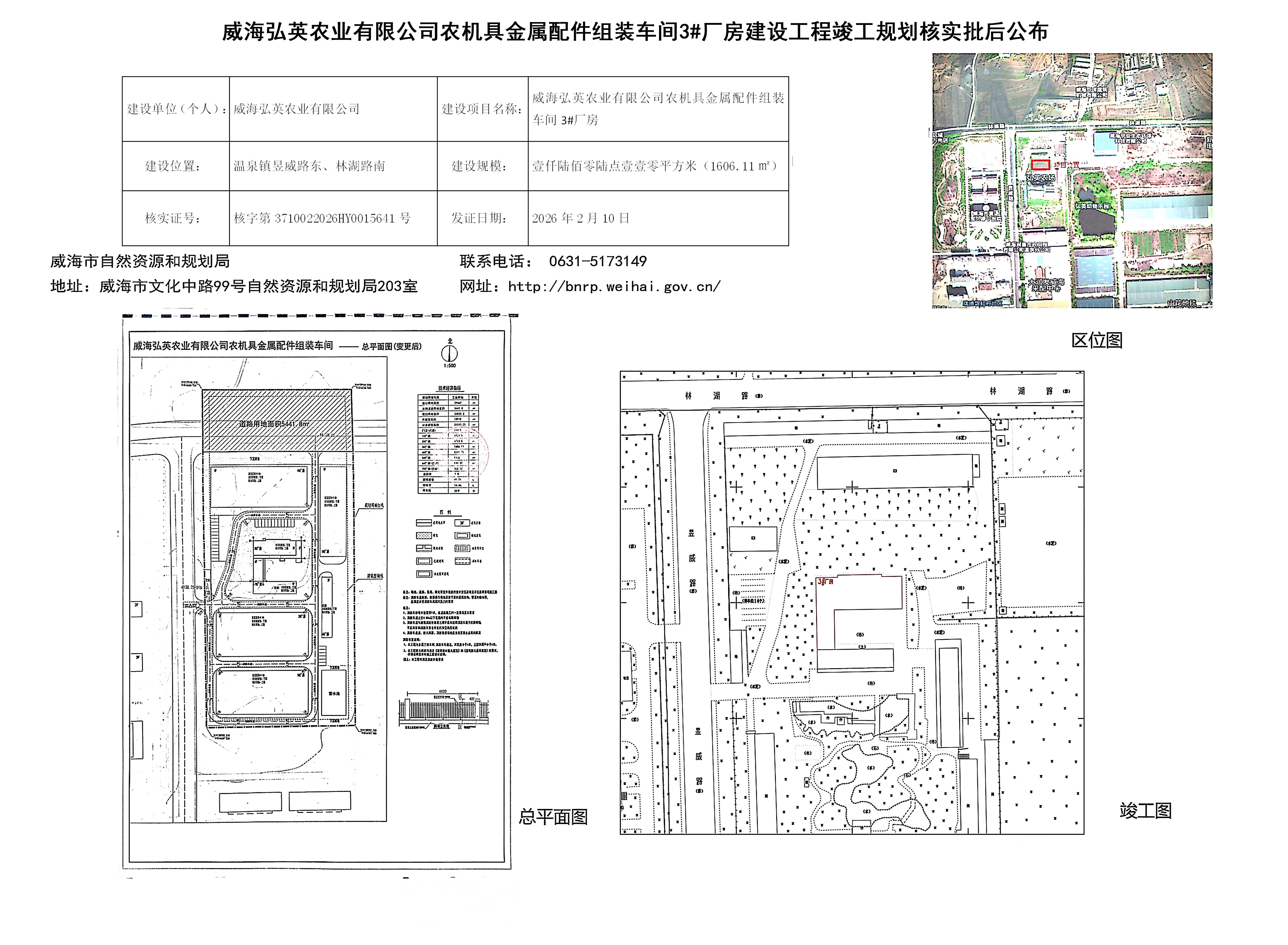 威海弘英农业有限公司农机具金属配件组装车间3#厂房建设工程竣工规划核...