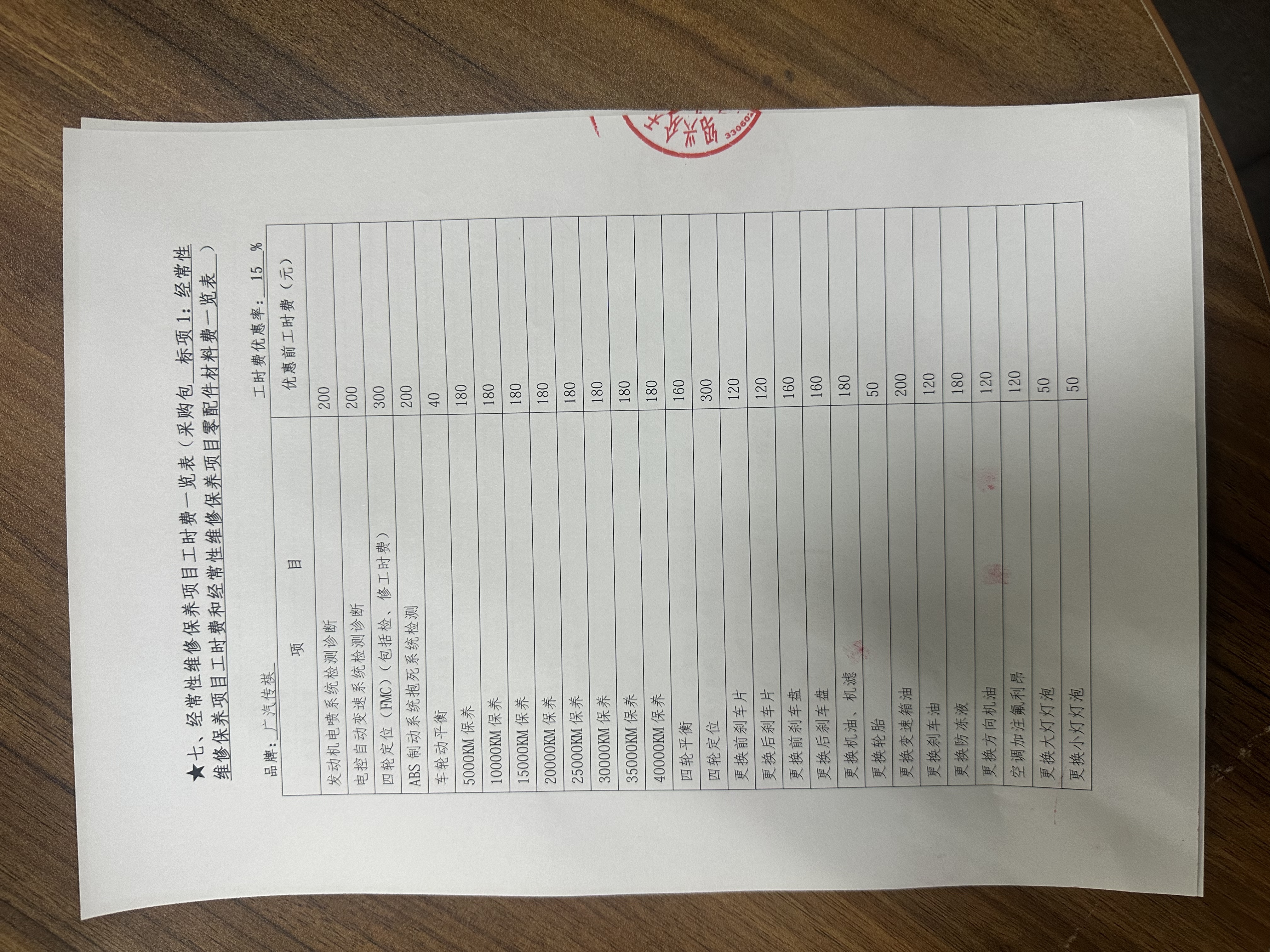 经常性维修保养项目工时费览表:*.***