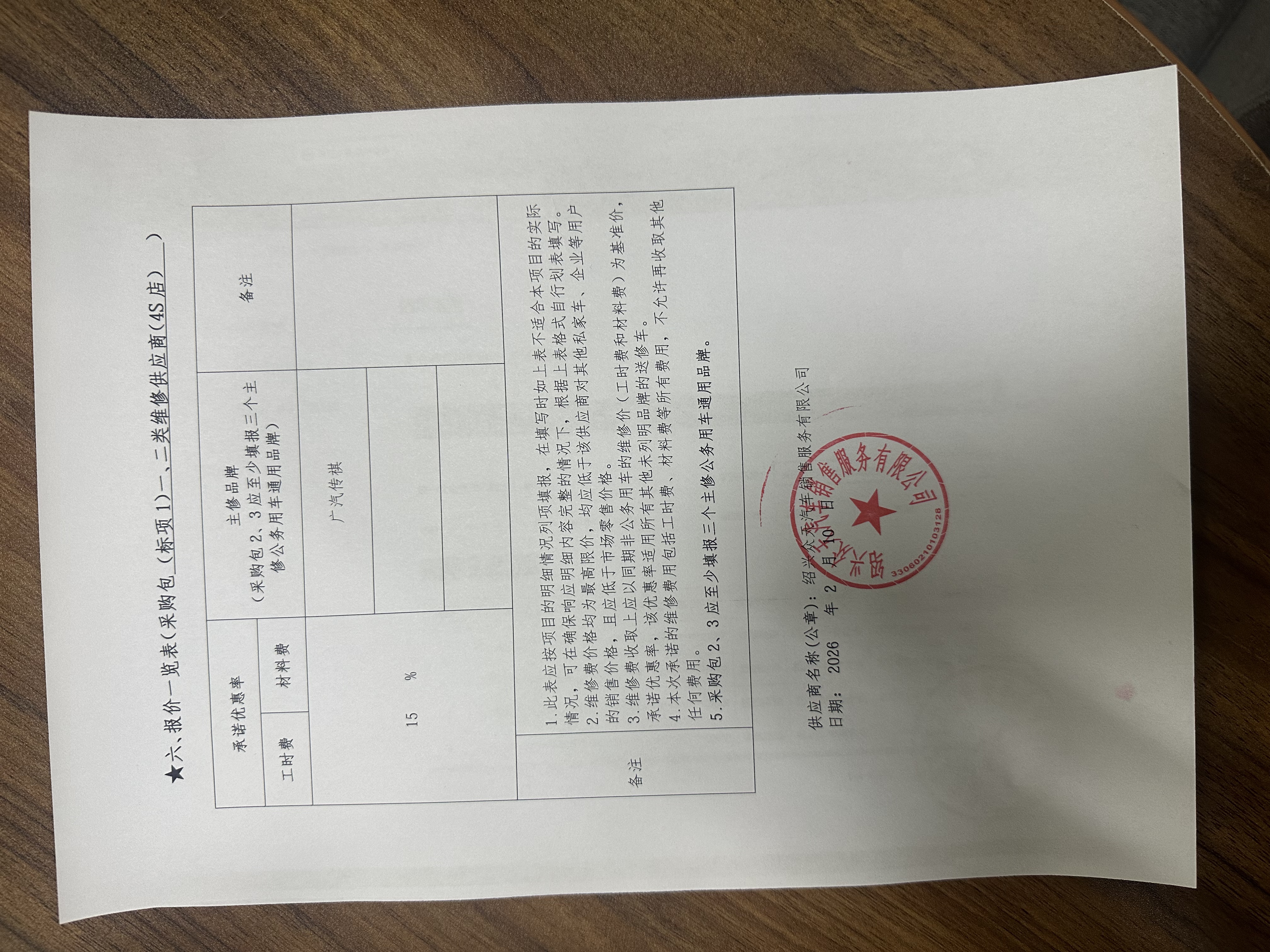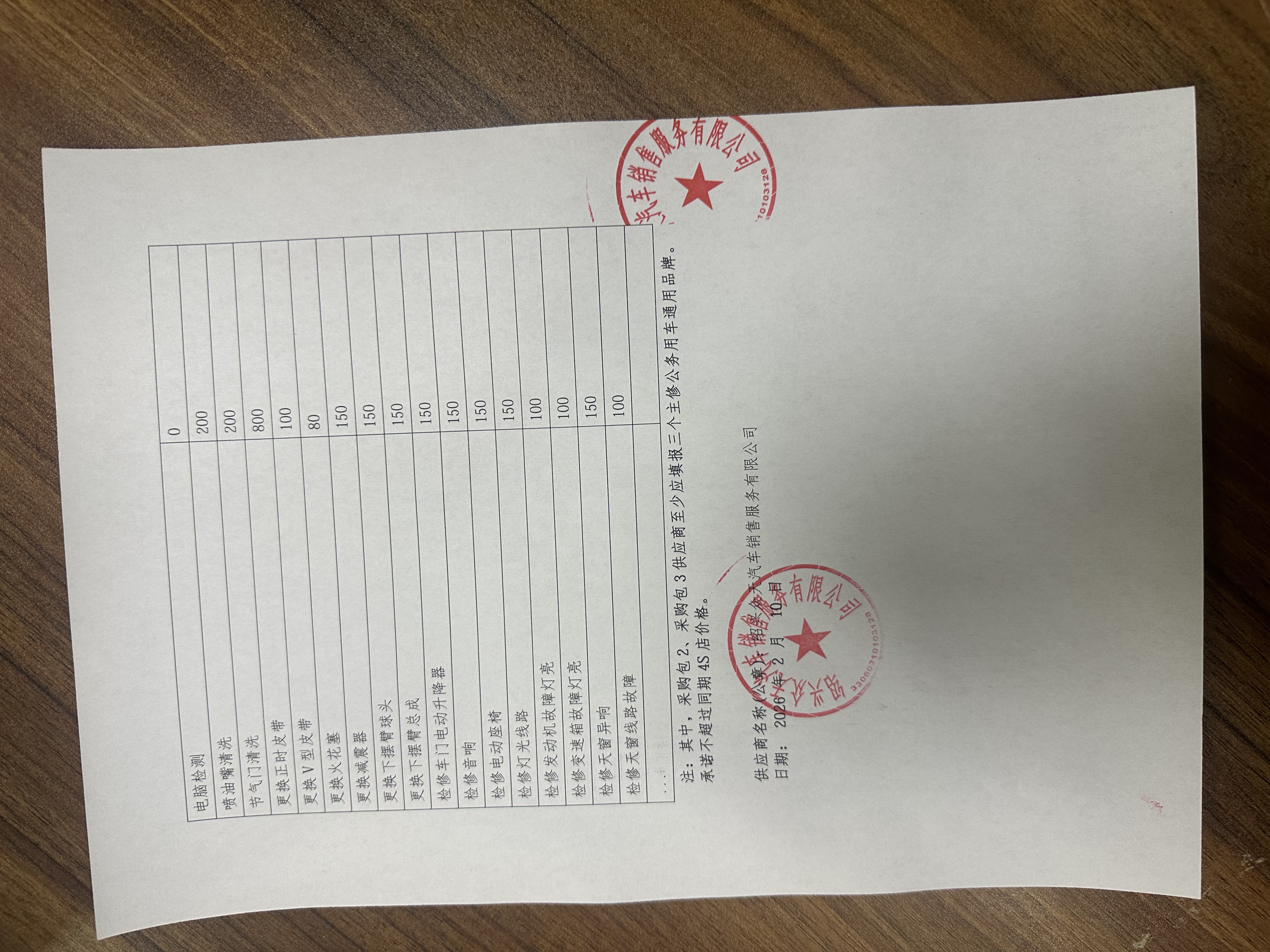 服务承诺:根据*********年度省级和绍兴市公务用车维修和保养服务开放式框架协议采购项目要求,我公司在入围范围内郑重承诺如下: 、承诺折扣率 折扣率(工时费、材料费) 工时** % 注:*.折扣率是指投响应产品的折扣率,“市场价×折扣率”为该响应方的最高限价,采购人可以根据实际的市场价格、产品折扣率,确定采购的最终价格。 *.折扣率不得高于给予其他客户维修的折扣率,也不得高于日常对外公布的折扣率。 二、报价览表(格式见附件***)、经常性维修保养项目工时费览表(格式见附件***)、经常性维修保养项目零配件材料费(格式见附件***)。 三、严格遵守国家法律法规,认真执行国家和相关地区汽车维修行业各项管理法规及规范性文件,合法经营,按章办事,诚实守信,自觉维护浙江省本级、绍兴市各级国家机关、事业单位和团体(以下简称:采购人)和浙江省政府采购中心、绍兴市公共资源交易中心的利益,树立浙江省本级、绍兴市机关国家机关、事业单位和团体公务用车维修供应商良好形象。 四、我公司承诺严格执行《*********年度省级和绍兴市公务用车维修和保养服务开放式框架协议》的全部条款和规定,在备案范围内和业务开展区域内全面履行响应承诺,服务标准不低于分支机构或网点(门店)所在地区约定的范本和该地区汽车维修经营服务规范及其他行业规定的相关条款,圆满完成汽车维修服务任务,确保质量,提供快捷、方便、满意的服务。 五、我公司承诺实行明码标价,折扣公开。我公司将设立浙江省本级、绍兴市各级国家机关、事业单位和团体组织公务用车维修服务专柜和专人接待,并在公司内明显位置公示市场公开报价、服务承诺以及维修价格、质量、服务的监督管理办法等;在浙江政府采购网及时更新汽车维修价格信息及车辆维修情况;保证在与同类企业竞争中,不使用恶意竞价等非正当手段。 六、我公司承诺成立服务团队,积极参与各种直接报价、线下询价等;在参与各种维修项目时,合理报价的折扣幅度不应低于响应折扣率;受理维修服务期间相关咨询、业务分办、项目疑议及服务投诉,并定期回访维修采购人。在受理投诉**小时内,了解核实情况,经核实确属我公司相关当事人员责任的,应按照相关规定予以处理,于*个工作日内将处理结果告知投诉人。 我公司**小时服务电话:************* ,总协调人:何勇 ,职务: 经理 ,办公电话:********,手机: *********** 。 七、我公司承诺对本项目“先服务、后结算”制度,依据采购人出具的有效函件(如公函、组织机构代码证等证明)或签署的合同、协议等实施维修服务,原则上不在服务前要求采购人提供押金、抵押、信用授权等。如有特殊情况将与采购人协商,取得采购人同意后方予实施。 八、对于维修服务,我公司承诺将按采购人需求制定详细的服务方案,并与采购人签订服务合同,内容包括时间、地点、内容、费用及结算方式、双方权利和义务、违约责任及意外风险(至少应包括意外风险承担方式、承担种类及金额)等条款。 九、我公司承诺做到以下服务要求: *.按照合同要求,选派技木人员提供维修服务。如需临时调换(但不允许转包)须征求采购人意见。 *.七项服务要求 (*)保证采购人获得优先服务的权利,并在有关部门额定的工时内完成维修工作。 (*)设有**小时服务电话,在接到采购人报修电话后*小时内予以响应,并能提供上门维修服务。 (*)能为采购人提供紧急救援服务,并在*小时内派人赶到救援现场。 (*)设有客户休息场所,并配备相关的配套服务设施。 (*)对送修车辆建立采购人档案,开展跟踪服务。 (*)为采购人维修的车辆定期免费检测调整制动、灯光、空调等系统。 (*)协助有关部门做好廉政工作,防止腐败现象的出现。 *.五项检测服务 包括发动机电喷系统检测诊断、电控自动变速系统检测诊断、四轮定位(***)(包括检、修工时费)、***制动系统抱死系统检测、车轮动平衡等服务。 *.质量保证期制度 (*)实行竣工出厂质量保证期制度。公务用车整车修理或总成修理质量保证期不低于车辆行驶*****公里或者***日;二级维护质量保证期不低于车辆行驶****公里或者**日;级维护、小修及专项修理质量保证期不低于车辆行驶****公里或者**日。质量保证期中行驶里程和日期指标,以先达到者为准。维修质量保证期,从维修竣工出厂之日起计算。 (*)在质量保证期和承诺的质量保证期内,因维修质量原因造成机动车无法正常使用,且在*日内不能或者无法提供因非维修原因而造成机动车无法使用的相关证据的,我公司应当及时无偿返修,不得故意拖延或者无理拒绝。 (*)在质量保证期内,因同故障或维修项目经两次修理仍不能正常使用的,我公司应负责联系其他已征集的供应商,并承担相应修理费用。 十、我公司承诺达到以下设备要求: 所配备的计量设备符合国家有关技木标准要求,并经法定检定机构检定合格。从事公务用车维修经营业务的设备、设施的具体要求按照最新国家标准《汽车维修业开业条件》相关条款的规定执行。 若响应采购包*,具有举升机、车轮动平衡、电子检测读码仪等设备。 十、我公司承诺达到以下人员要求: 若响应采购包*或采购包*,各配备至少*名技木负责人员、质量检验人员、业务接待人员以及从事机修、电器、钣金、涂漆的维修技木人员。技木负责人员应当熟悉公务用车