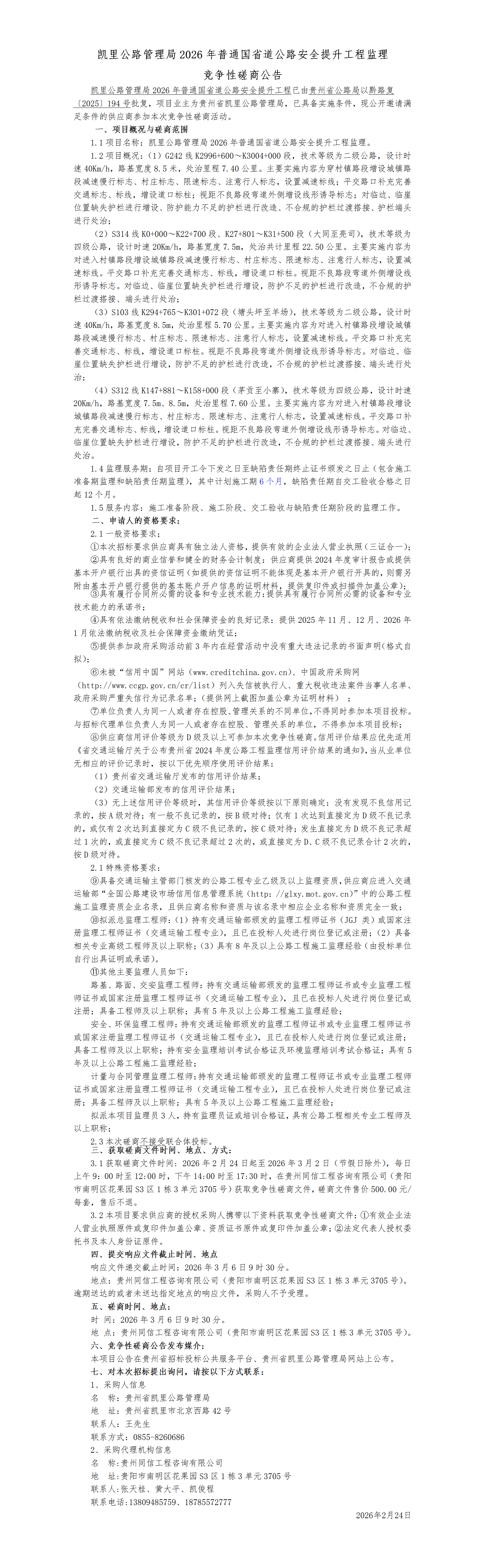 凯里公路管理局2026年普通国省道公路安全提升工程监理竞争性磋商公告