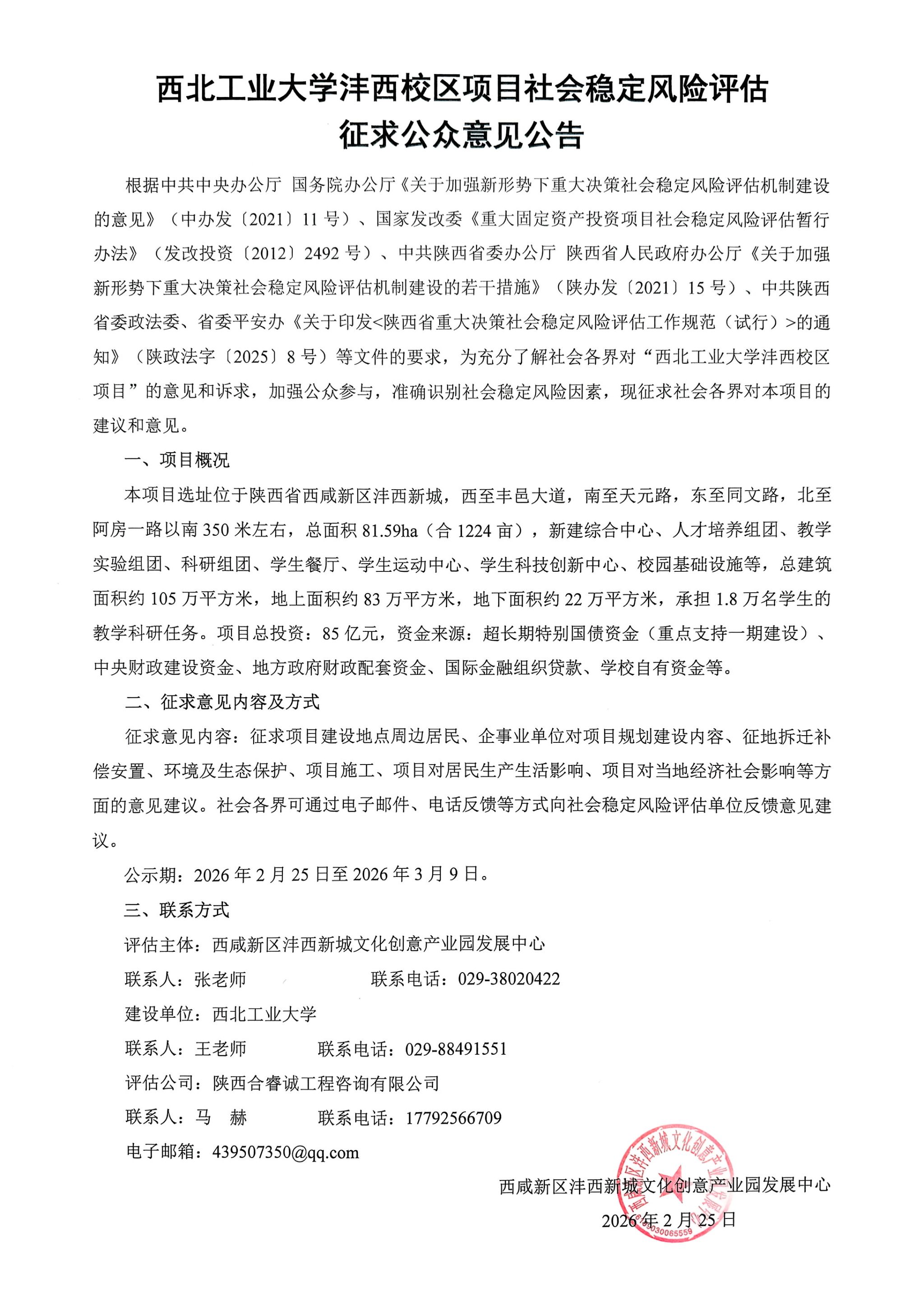 ·西北工业大学沣西校区项目社会稳定风险评估征求公众意见公告