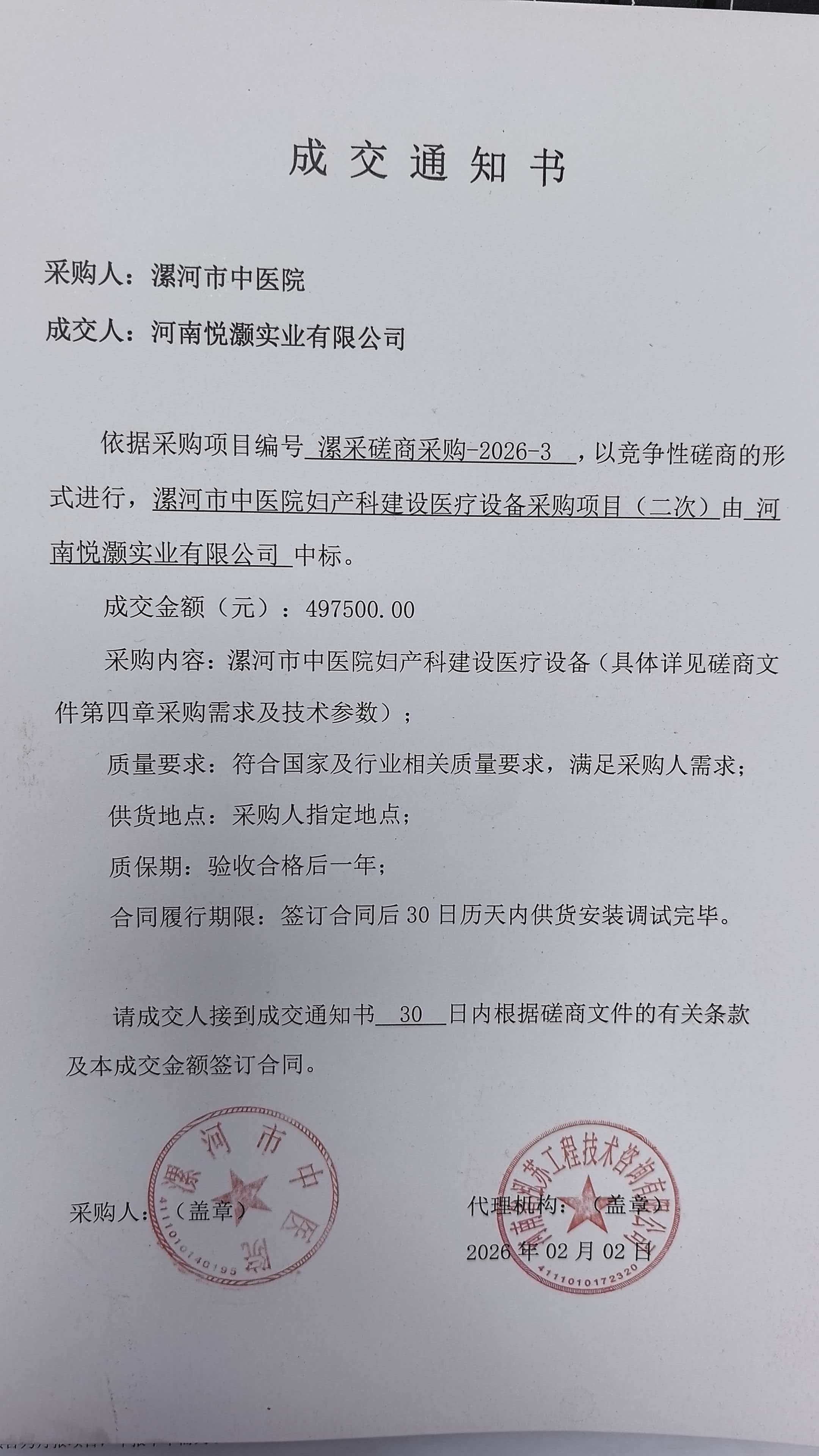 | 二、合同名称:漯河市中医院妇产科建设医疗设备采购项目 | ||||||||||||