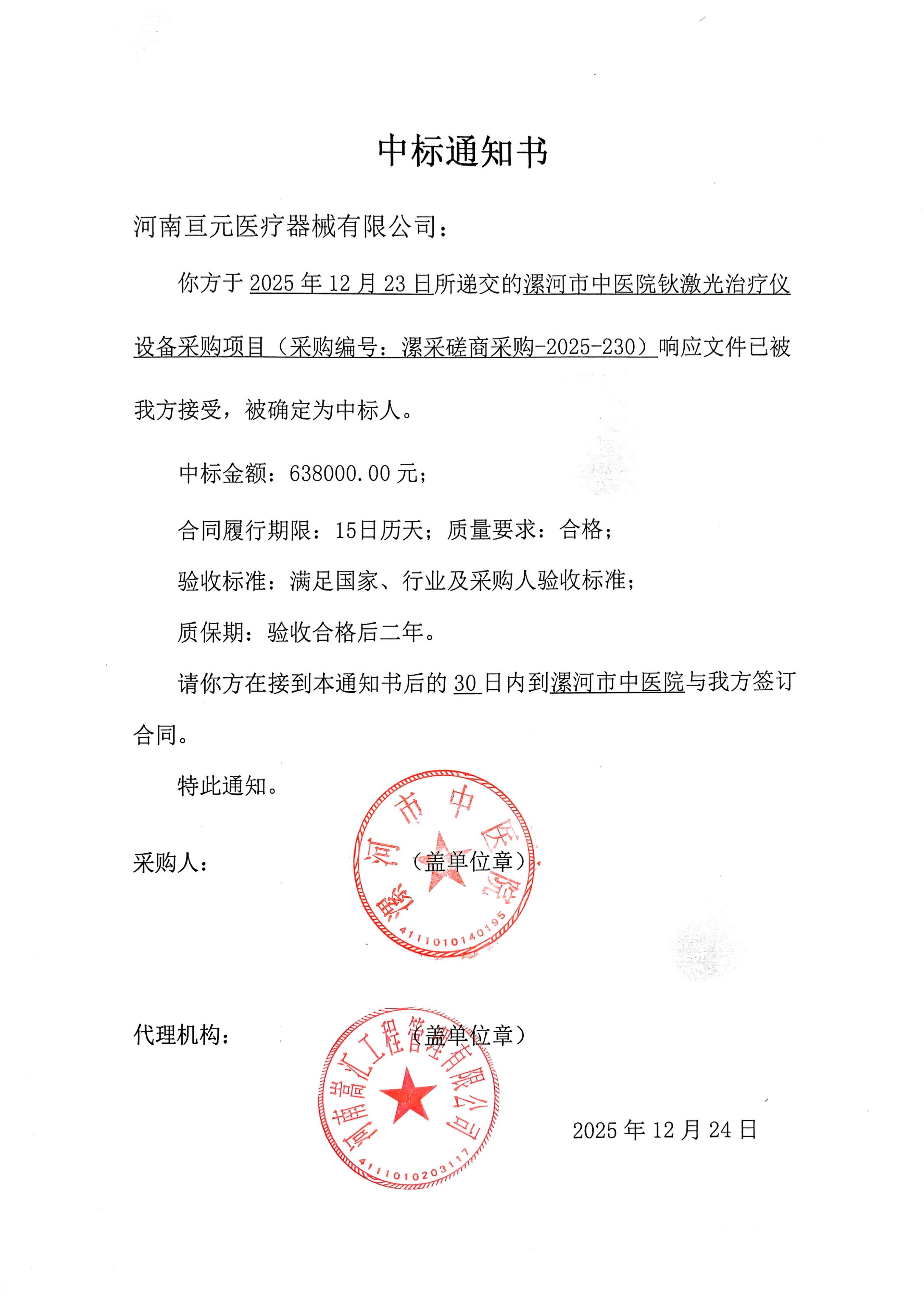 | 二、合同名称:漯河市中医院钬激光治疗仪设备采购项目 | ||||||||||||