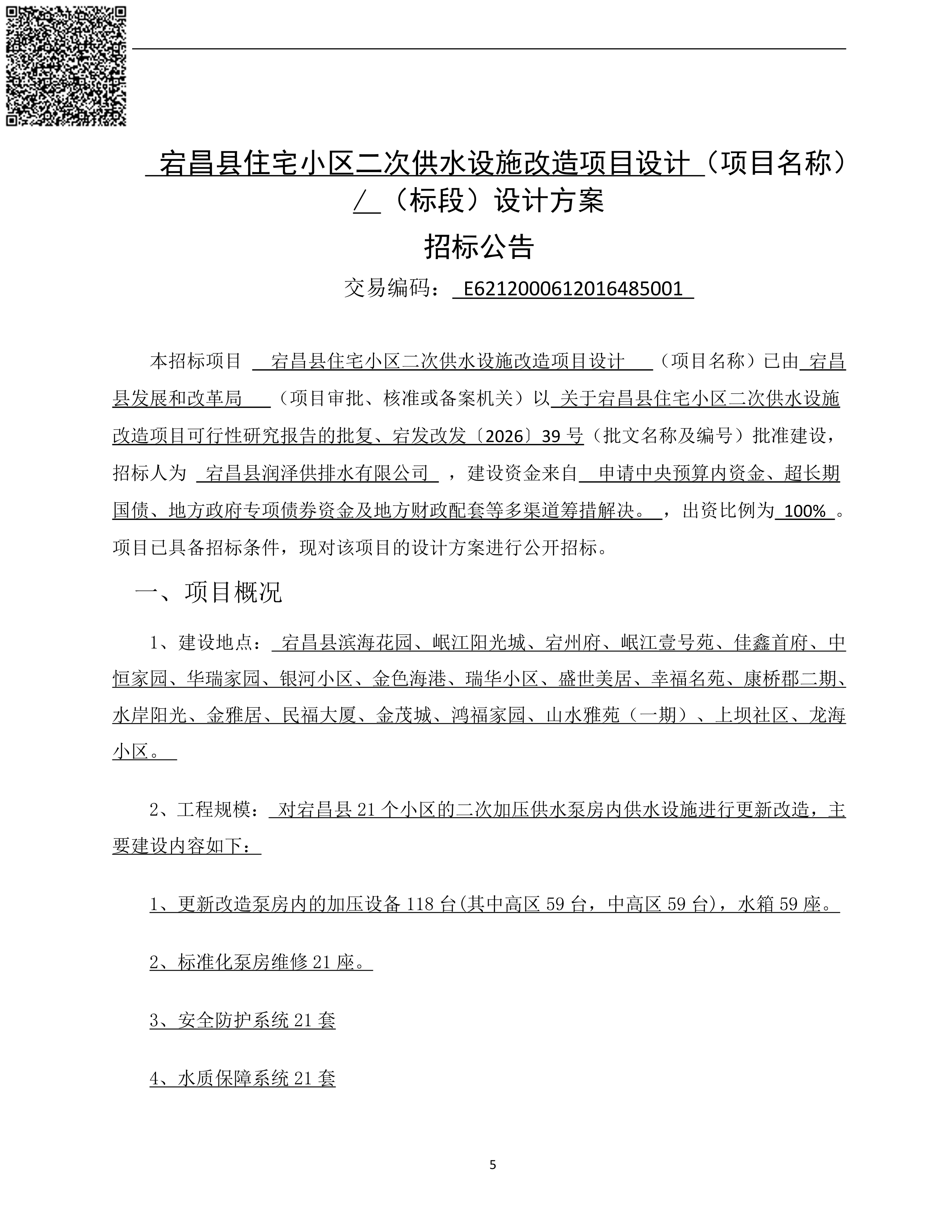 宕昌县住宅小区二次供水设施改造项目设计招标公告