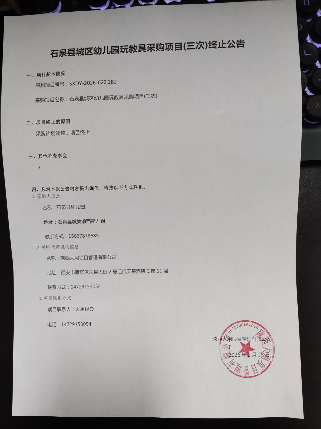 石泉县幼儿园关于石泉县城区幼儿园玩教具采购项目(三次)终止公告