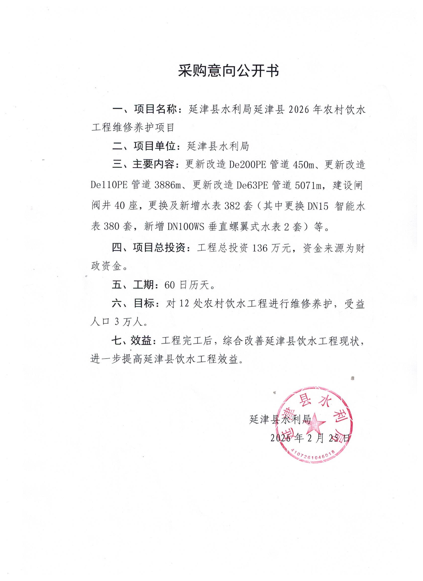 为便于供应商及时了解政府采购信息,根据《河南省财政厅关于开展政府采购意向公开工作的通知》(豫财购〔****〕*号)等有关规定,现将延津县水利局 ****年*(至)*月采购意向公开如下: |