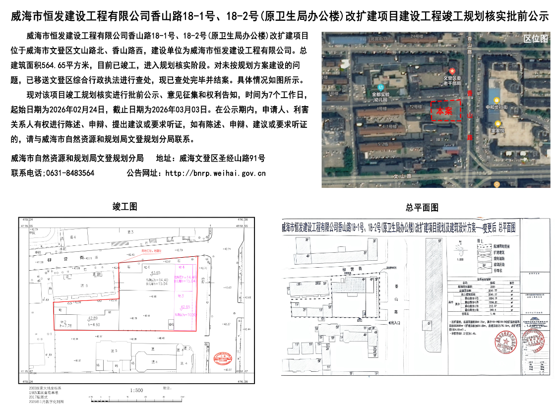 威海市恒发建设工程有限公司香山路****号、****号(原卫生局办公楼)改扩建项目建设工程竣工规划核实批前公示