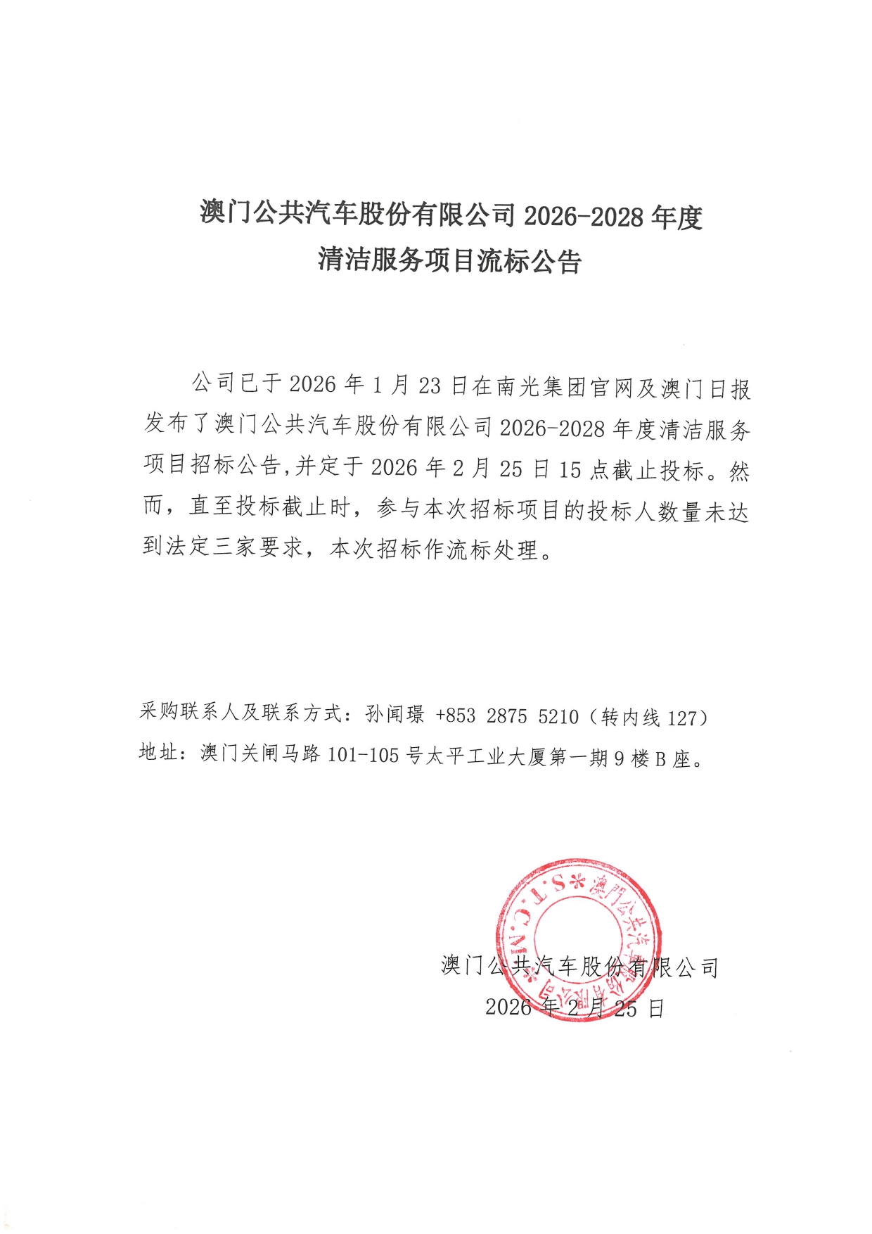 澳门公共汽车股份有限公司2026-2028年度清洁服务项目流标公告