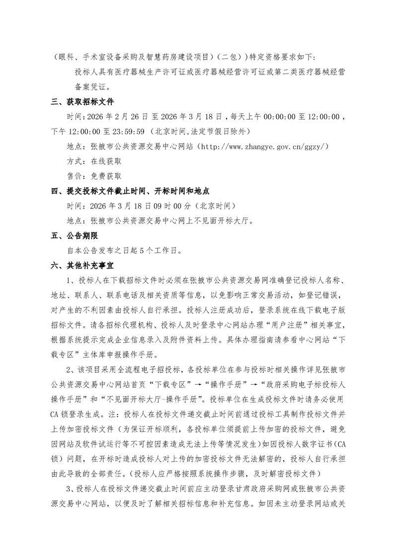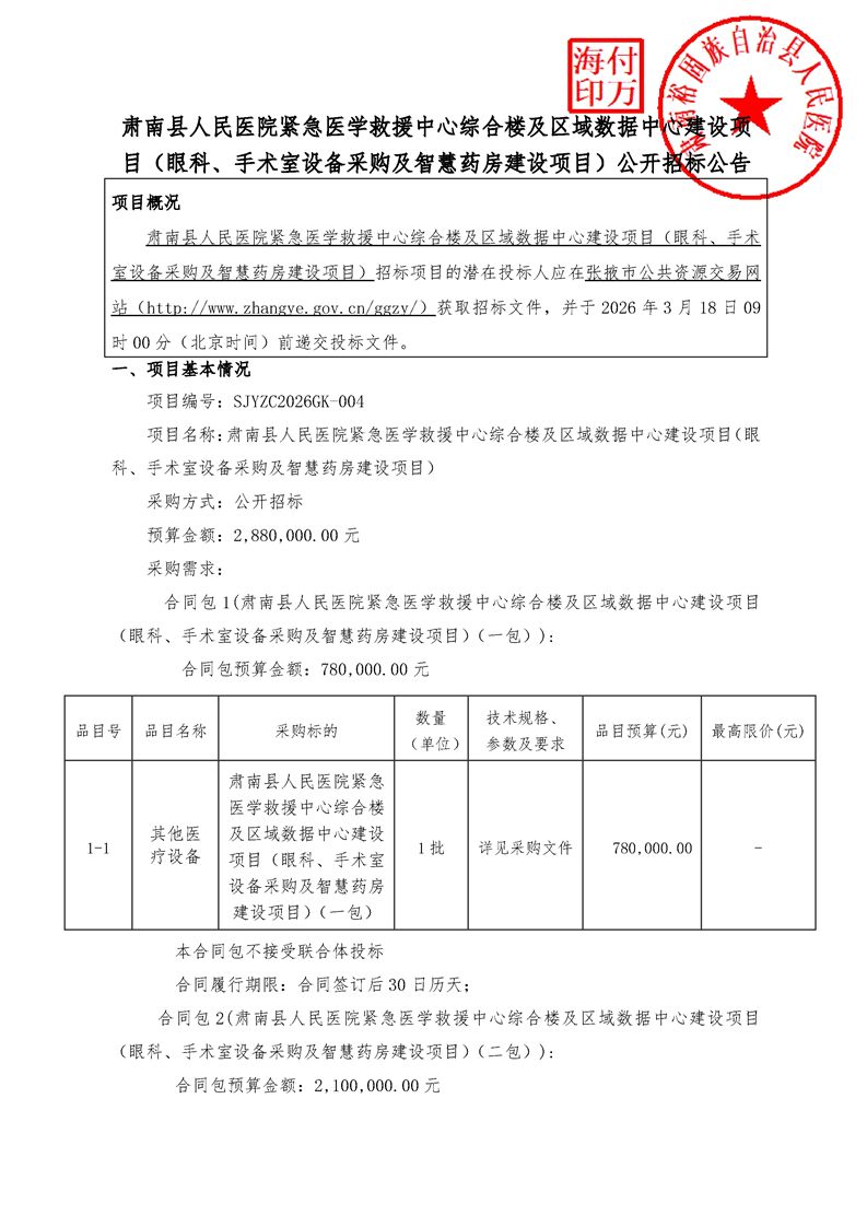 肃南县人民医院紧急医学救援中心综合楼及区域数据中心建设项目(眼科、手术室设备采购及智慧药房建设项目)[采购/资审公告]