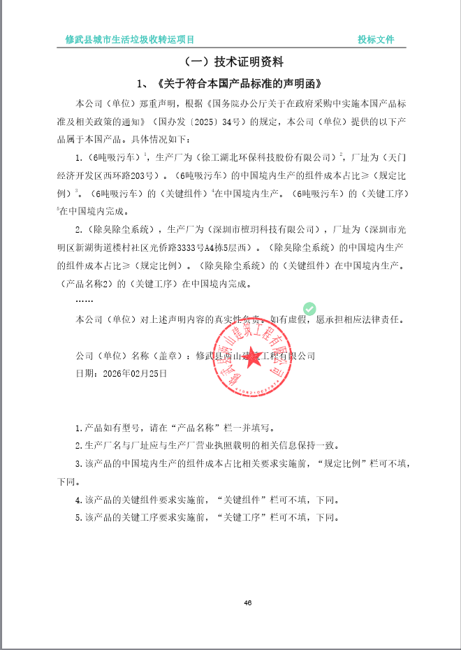| 采购内容:修武县城市生活垃圾收转运项目(具体详见招标文件采购需求) 采购范围:设备的供货、运输、保险、装卸、安装、检测、调试、试运行、验收交付、培训、技术支持、售后保修(运行、维护、软件升级,如有)及其他相关伴随服务。 合同履行期限:**日历天。 | |||||||||||||||||||||||||||||||