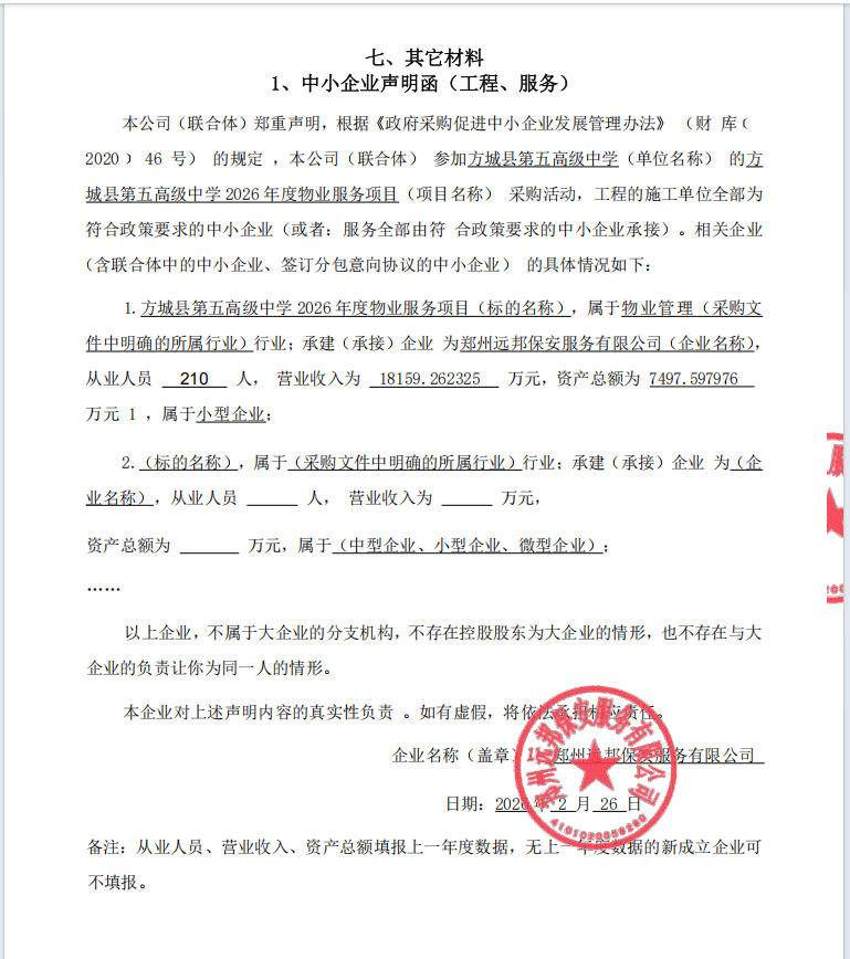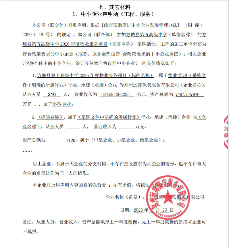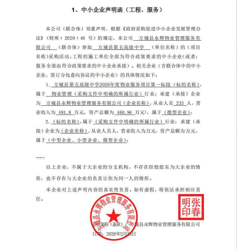 方城县第五高级中学2026年度物业服务项目-中标公告