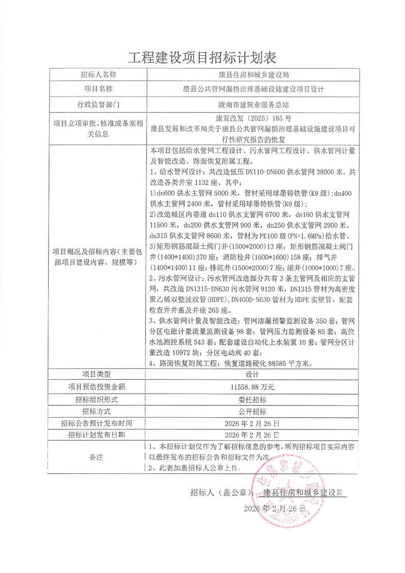 康县公共管网漏损治理基础设施建设项目设计招标计划