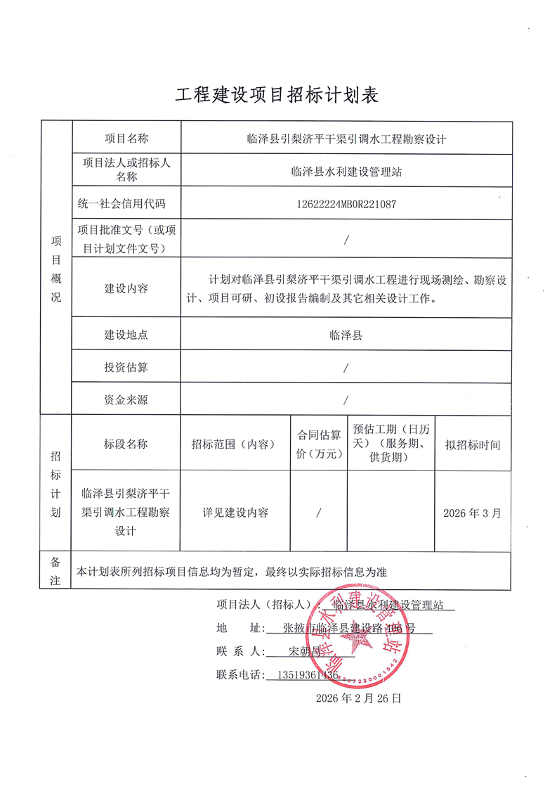 | 招标项目名称 | 临泽县引梨济平干渠引调水工程勘察设计 | ||