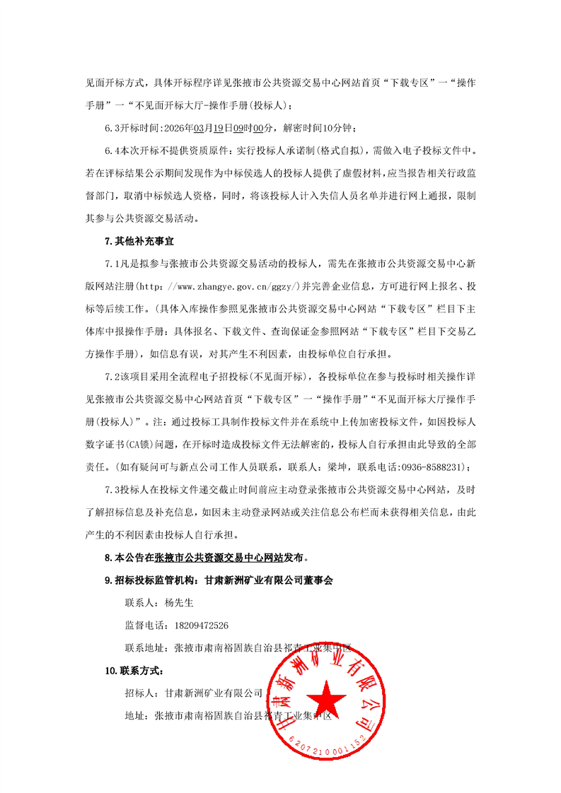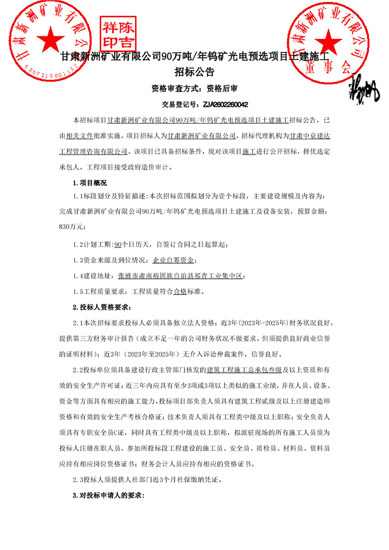 甘肃新洲矿业有限公司90万吨年钨矿光电预选项目土建施工招标公告[招标/资审公告]