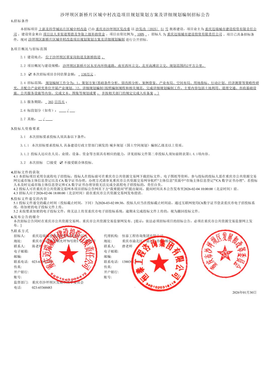 名称: 坪坝区新桥片区城中村改造项目规划策划方案及详细规划编制招标公告
